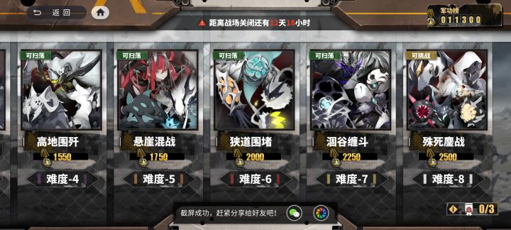 一、基础机制1、分8个难度,每天赠送1份合作文件(入场券),8天可以全通关,没有三星条件。合作文件积累上限3点,每累积3天要消耗完。打输或者左上角退出都会返还合作文件,可以无损耗凹关。通关之后可以再用合作文件继续扫荡,扫荡最后一关给的军功最多。2、每关开始之前可以点“波次详情”,拉到最底下看最后一波BOSS是什么属性,基本这关就可以用克制属性去打(第7关例外,下面会说到)。3、通关后会获得军