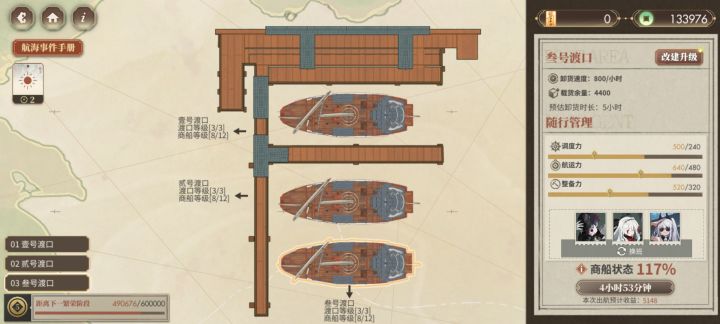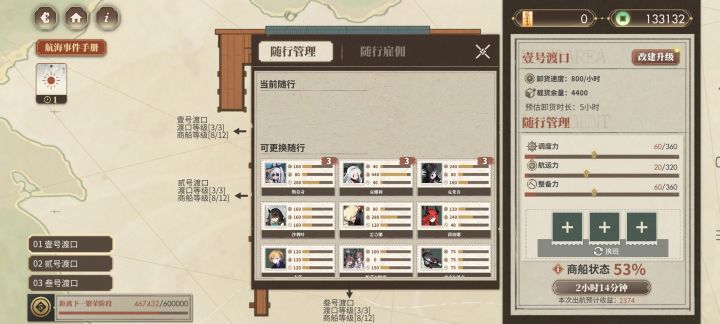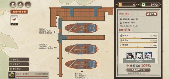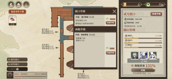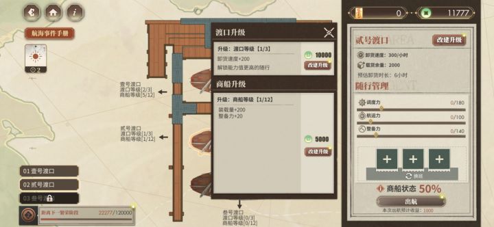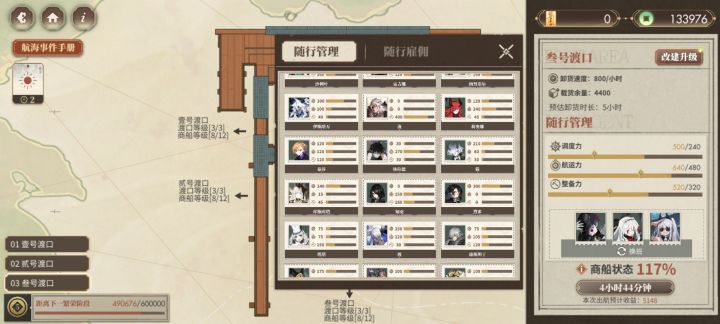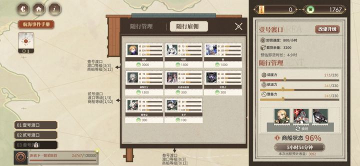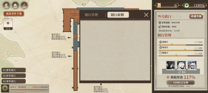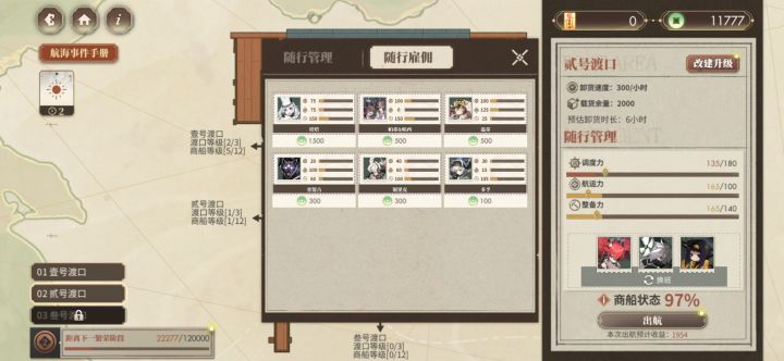 本来打算都卡6小时的(越升级商船等级,每小时收益越低是什么鬼),结果叁号渡口升级需要的钱有点多,就都卡5小时了(每天四次,有四小时的空闲时间还挺舒服的)。钱太多了,于是就把随从全雇了,但只需要三个