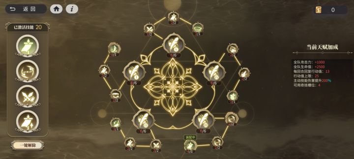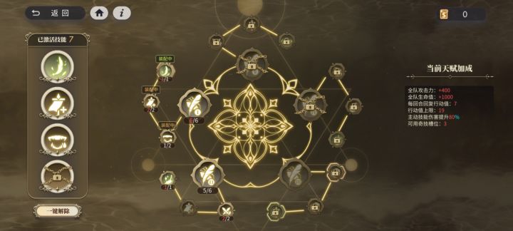 目录(一)天赋参考(二)敌方情报(三)阵容参考(四)对局思路(一)天赋参考奇技活化(空裔奇技):玩家立即获取7点行动值,每3回合可释放1次活力强化(被动奇技): 阵容参考每间隔1回合,额外回复行动值4点 生命抽取(被动奇技): 光灵攻击时获得3%吸血战斗活跃(被动奇技):本回合玩家每消耗1点行动值,光灵连锁技能伤害提升3%,上限15层要是卡关了,就把自己护符天赋拉拉满,