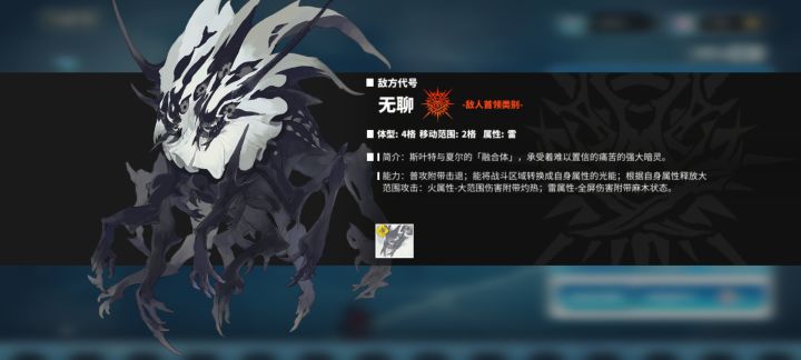 H5-起源目录(一)敌方情报(二)阵容参考(三)对局思路(一)敌方情报技能展示:[剧烈攻击]:对范围内的目标进行1次攻击并击退。[能量释放-焚]:无聊凝聚力量, 准备释放十字大范围火属性攻击,对命中的目标造成伤害和附带灼热, 凝聚力量时无法被打断。[暗能灼热]:无聊吸收周围1圈和自身属性相同的格子能量 ,对范围内的目标进行攻击(吸收的格子越多,伤害越高),击中后附加灼热状态