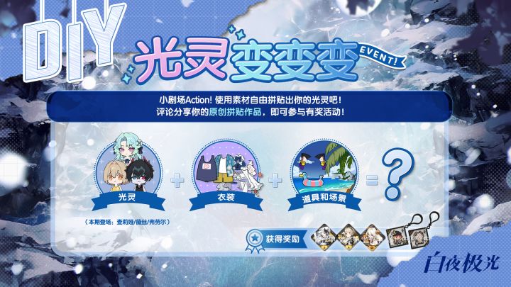 白夜小剧场Action!使用素材自由拼贴出你的光灵吧!✦ 活动时间 ✦2023年10月8日—11月3日 23:59✦ 参与方式 ✦在评论区留言贴出你的拼贴作品,即可参与有奖活动!※导航员请下载下方素材,DIY你的光灵吧~素材链接:P.S.除了原有素材的拼贴,导航员还可以自由涂鸦一番,“摸鱼”出不一样的光灵噢~※ 本期拼贴活动包括以下素材:登场光灵:查莉娅、薇丝、弗劳尔可换衣装