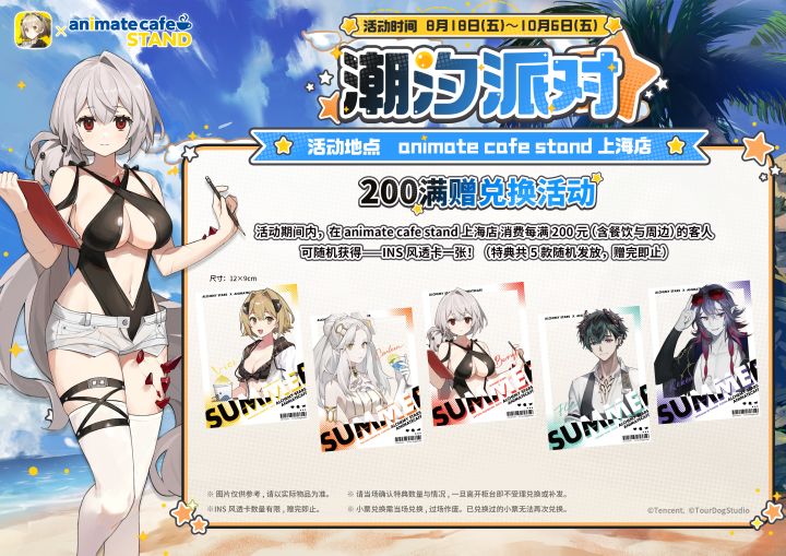 「白夜极光×Animate cafe STAND」联动线下主题店即将开启!▋活动地点:Animate cafe STAND 上海店(上海市静安区静安大悦城北座8楼N809-2)▋活动时间:2023年8月18日-10月6日潮汐派对,线下开启!「潮汐奏」主题限定饮品、甜品美味登场,特典纸杯垫随餐赠送,更有丰富限定周边随心选购!导航员到店即享,无需预约噢~炎炎夏日,与你的心仪光灵来一杯同款特调