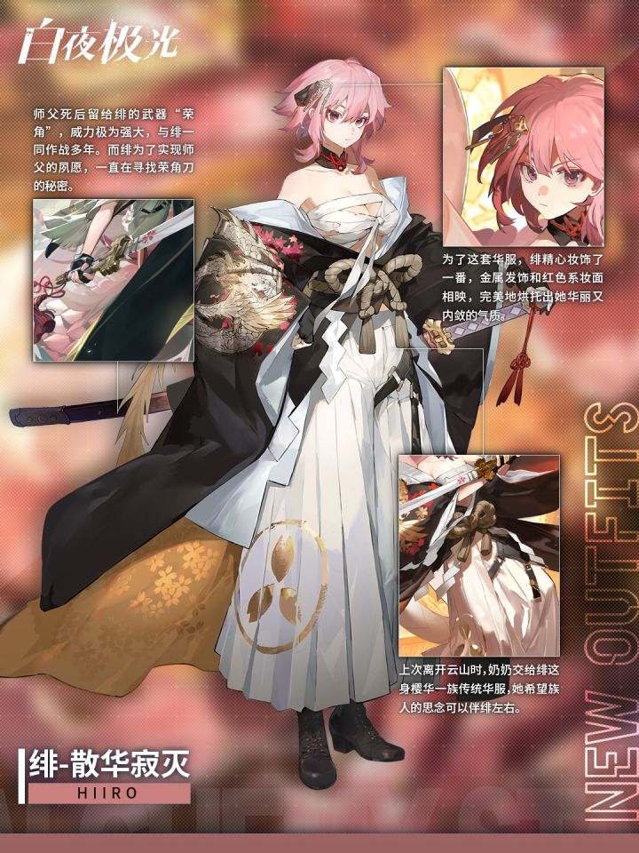 ✦绯 | 寻愿蜕变时装「散华寂灭」✦云岛山神封印出现异动,收到书信的绯决定前去调查事态。上次离开时,奶奶给了她樱华一族所留的华服,她还未曾穿过,也未曾正式感谢奶奶的付出。此行,她决定穿上这华服,和你一起再次回到阔别已久的故乡。▌获取方式:该时装拥有2个点触互动表现、2张全新时装插图、新语音、新战斗特效等内容,可通过寻愿蜕变活动获得,使用道具【心愿之力】可以进行寻愿,并获赠寻愿奖励。心愿之力可通