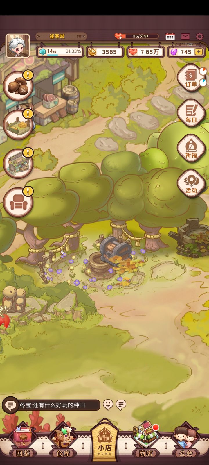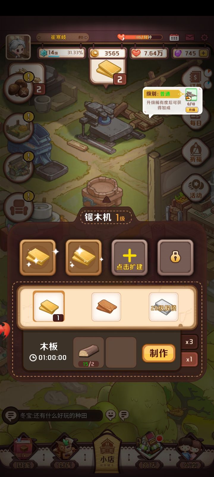 这样子的游戏我还是第一次见,资源给的抠搜扒拉的。作为一个新的游戏,基本上成功引起了每个玩家的吐槽和恶心,这也真是不容易,也算成功吧。这样一比,隔壁仙山小农和唐朝甩你几条街都不止,别还没等到公测就已经凉了。到了公测还这样,那指定没戏。这个锯木机升级我也真是服了,意思就是我可以同时放三块板排队是么,那我扩建和升级选一个不就好了么,还浪费本来就不多的资源,这不冲突么,反正木头本来就不够,吐了。还有这个宝箱,卡在种花的地方,点还点不到,气死我了。