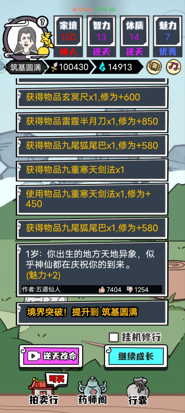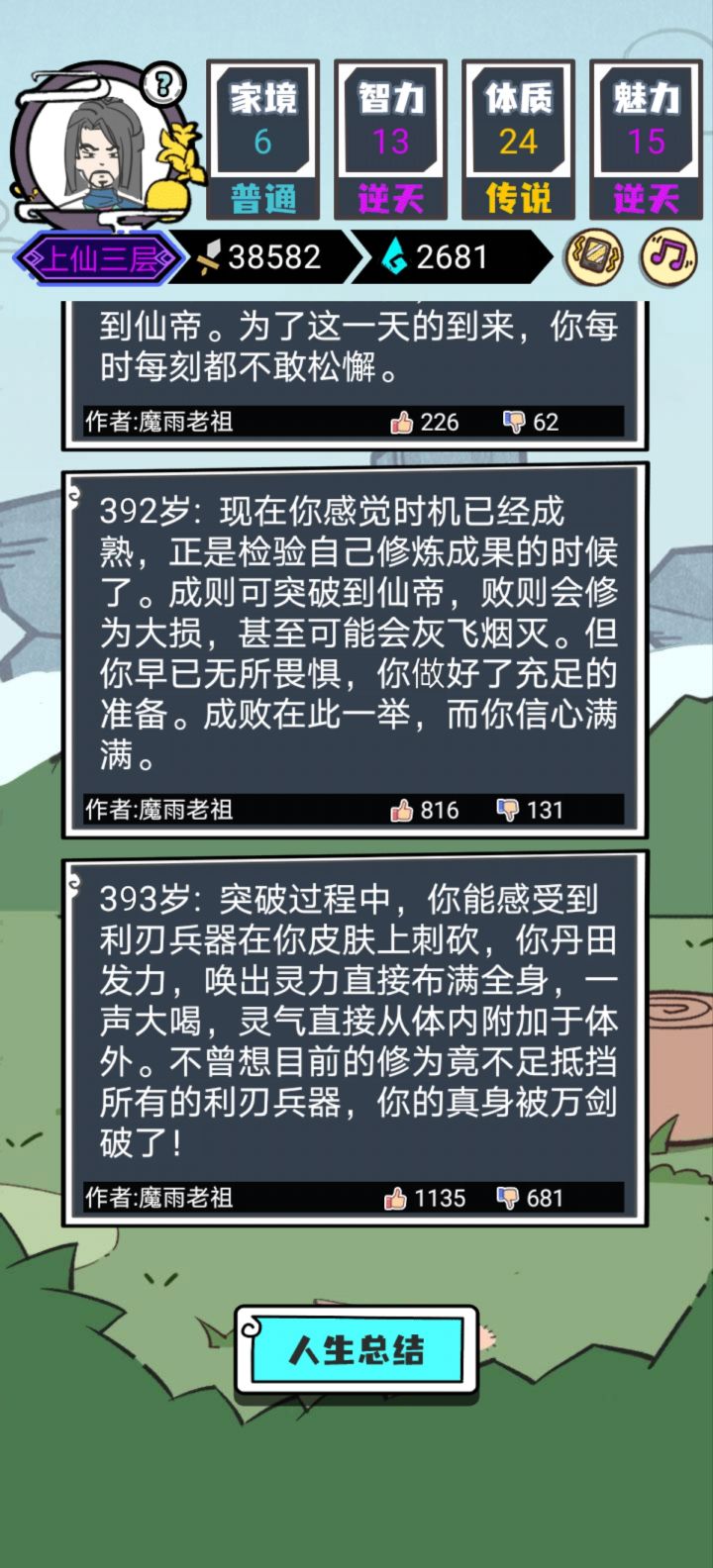 (版本1.1)说一下上仙必死的问题,其实上仙是要手动堆到圆满才不会死,因为主角会在成上仙后又马上选择渡劫(仙帝成仙尊也会修为不足,也是自己堆),而且要紫色渡劫天赋,金色的可以到仙尊。上仙到仙帝好像是50000,仙帝到仙尊要75000左右的修为