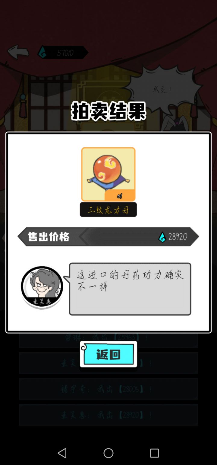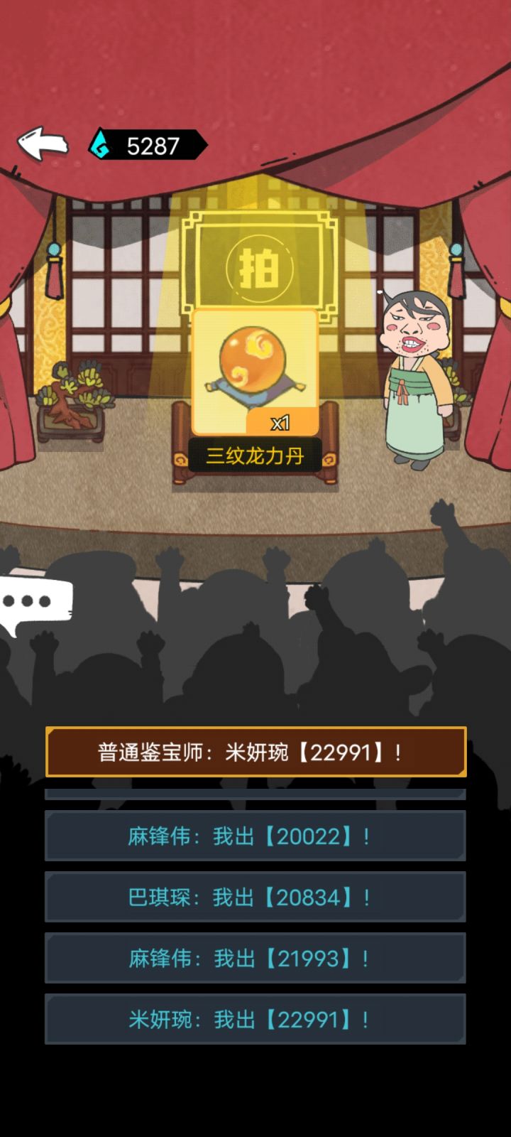 遇到武器和功法尽量拍下来,紫武大概2000,橙武3000,第一次就出这个价基本可以拍下来,武器买下来再找总监卖必定不亏,还可以白嫖修为,如果不刷商店丹方可以不用买,功法正常4000,毒煞5000可以拍下来