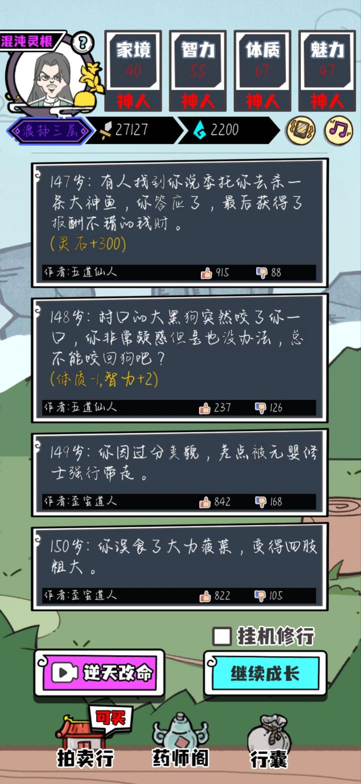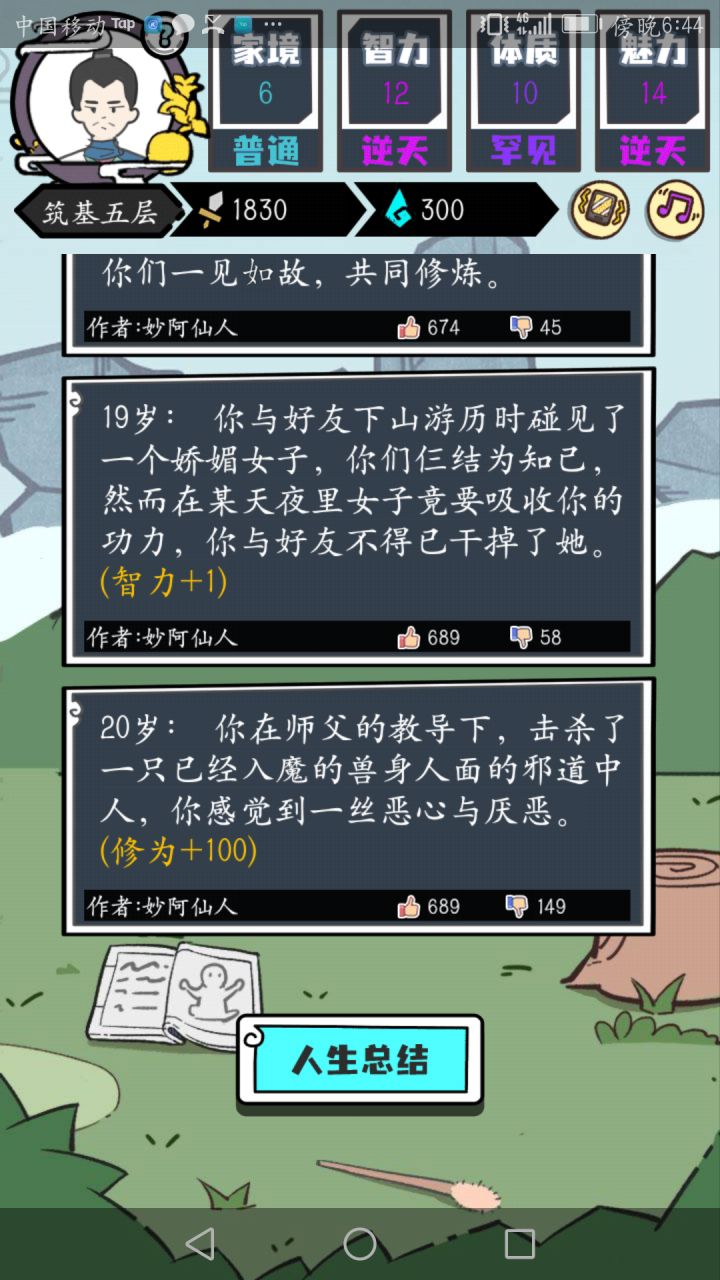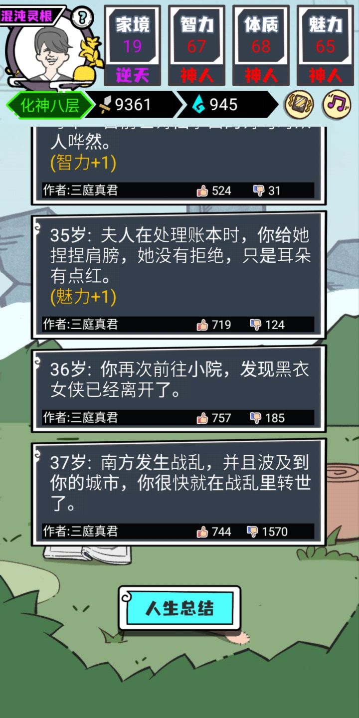 随机事件要注意逻辑欸,堂堂渡劫大佬被元婴掳走还行???之前也是,父母前天离世然后第二天吵架打塌一座山可还行???把事件逻辑修复下,不同实力阶段不同的事,这个游戏能帮开发者门赚更多钱😬