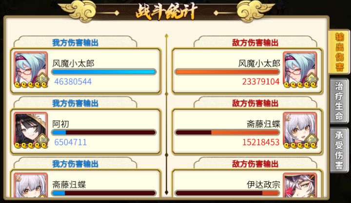 【进攻阵容】早云的加攻击好像很适合风魔,上了早云,风魔把把3千万—4千万伤害,风魔这家伙估计没少打队友刷伤害输出伤害:治疗生命:承受伤害:式神图:二赛季一定要弄大天狗,二赛季一定要弄大天狗,二赛季一定要弄大天狗,重要的事情说三遍!没有大天狗二赛季建议重开!!!【神器作业】长宗我部元亲 定位:前排坦克北条早云 定位:增益队友斋藤归蝶 定位:奶妈风魔小太郎 定位:核心输出阿初
