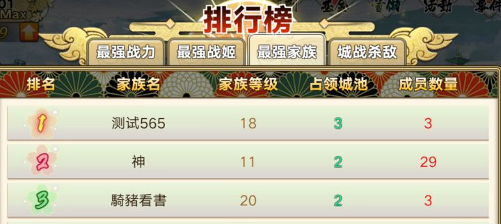 家族就是公会,这个游戏你想好好玩下去就必须得加入一个家族,而且是厉害的家族。为什么这么说,第一点:必须得有一个家族才能玩攻城战;第二点:家族越强你获得的各种资源奖励就越高,才能快速提升自己的实力。怎么判断一个家族强不强,点开排行榜的最强家族,看家族的人数和占领城池数,厉害的家族这两项数据都较高,不能光看排名。怎么加入家族?你升到23级就可以加入或者创建一个家族了,如果你时间精力少不想管理家族