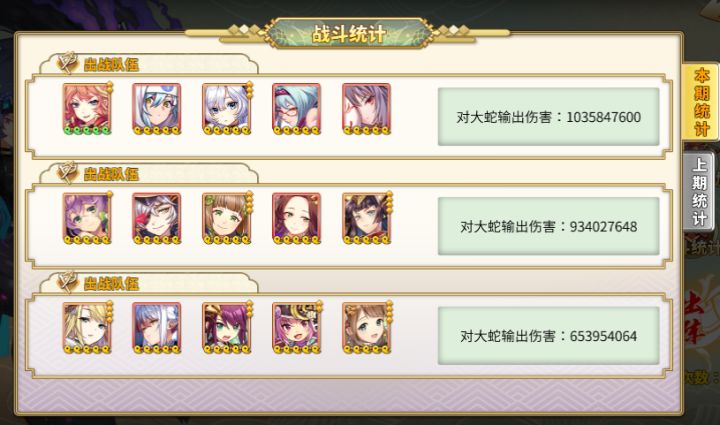 不多比比,直接上伤害图一队阵容组成:长宗、风魔、上杉、北条、义龙站位:神器作业:一队伤害图一览:备注:长宗、北条、义龙都是顶级挂件,想打高额伤害的数据表现,这三差不多都是必带的长宗因为很肉而且给队友加暴击,带造成以自身兵力为主的流血伤害的神器会很厉害北条捡破烂,其他几个战姬流血带的差不多了,剩下的就给她带上杉、风魔这不多说了,减少boss防御debuff啥的似乎没啥用,4围属性很高