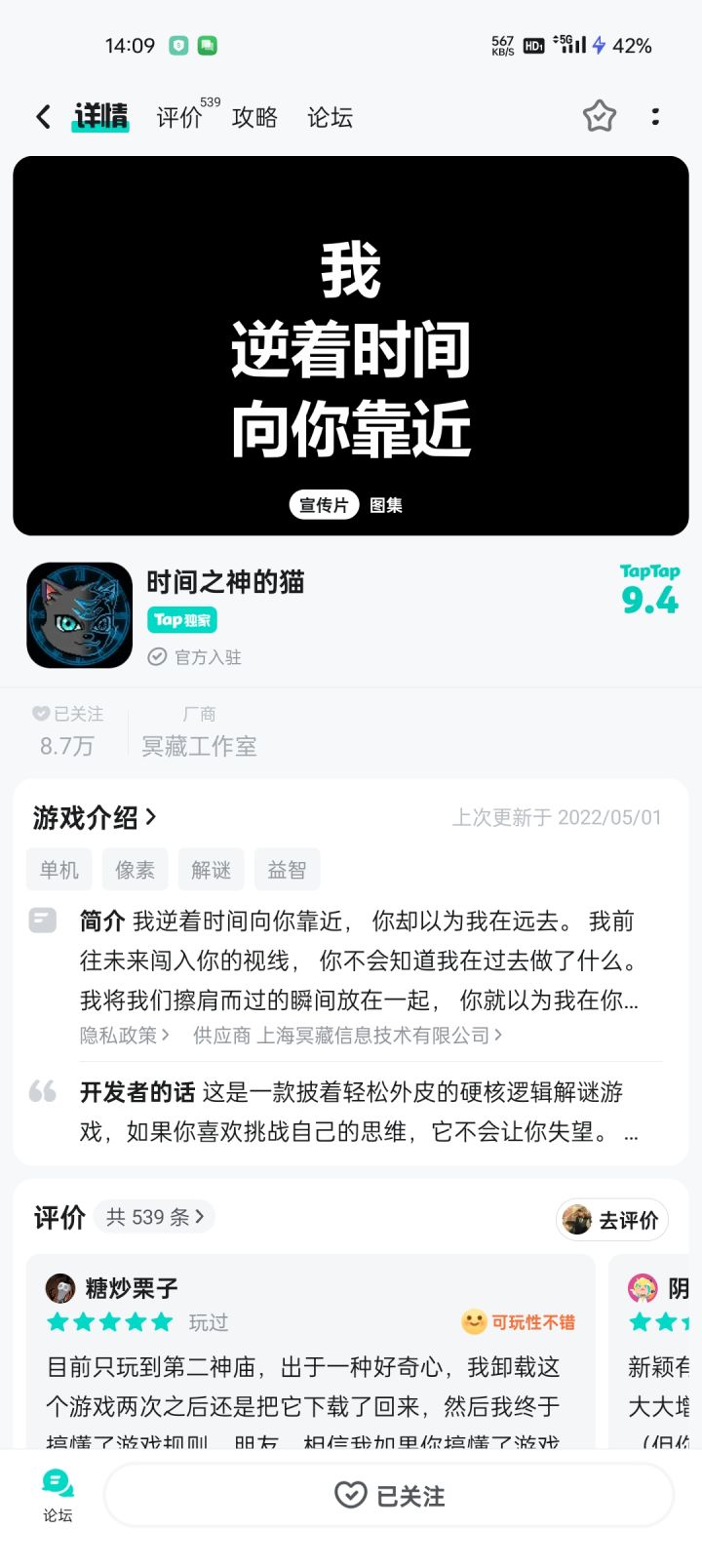 这个游戏很小,但是提出了很不得了的想法。波斯王子只是用了时间相对流速的概念,这个游戏用了时间相对中不连续的概念,既时间是无限个点连成的线,但我们可以让那只猫的时间线拆开不连续。同时是否也可以理解瞬间移动不一定是空间的移动,也有可能是时间节点不连续造成的。可惜游戏?制作成本太低了,如果有大投资简直可以和传送门媲美!