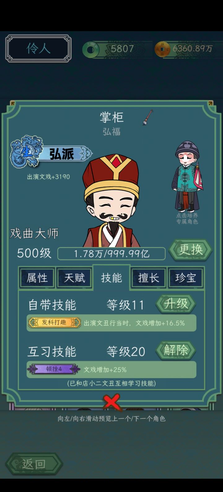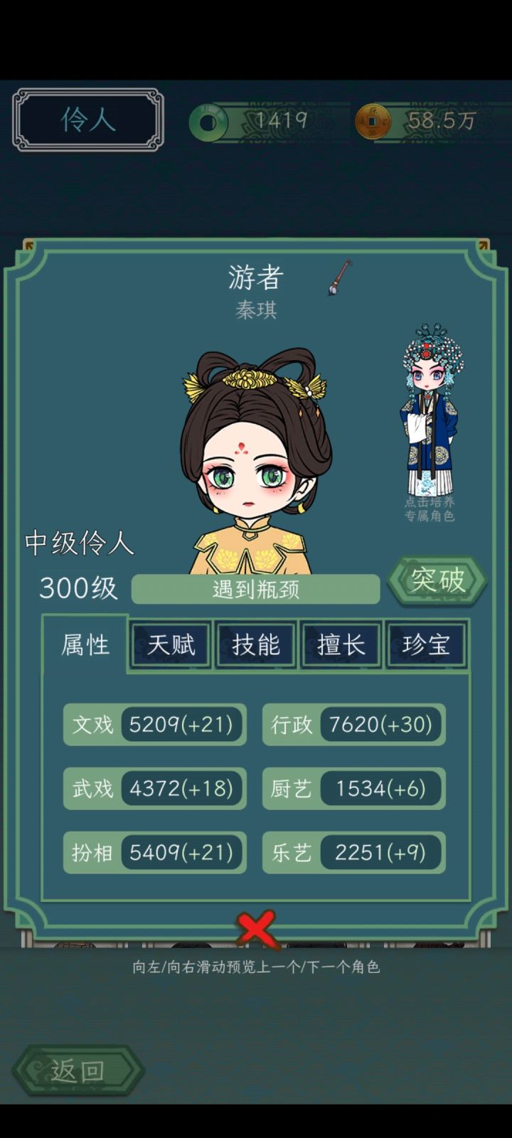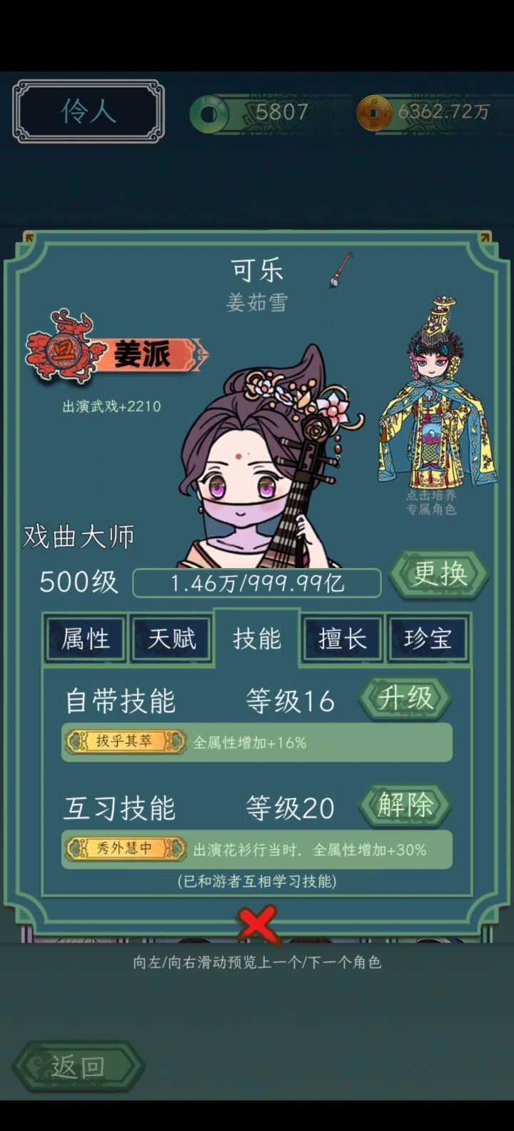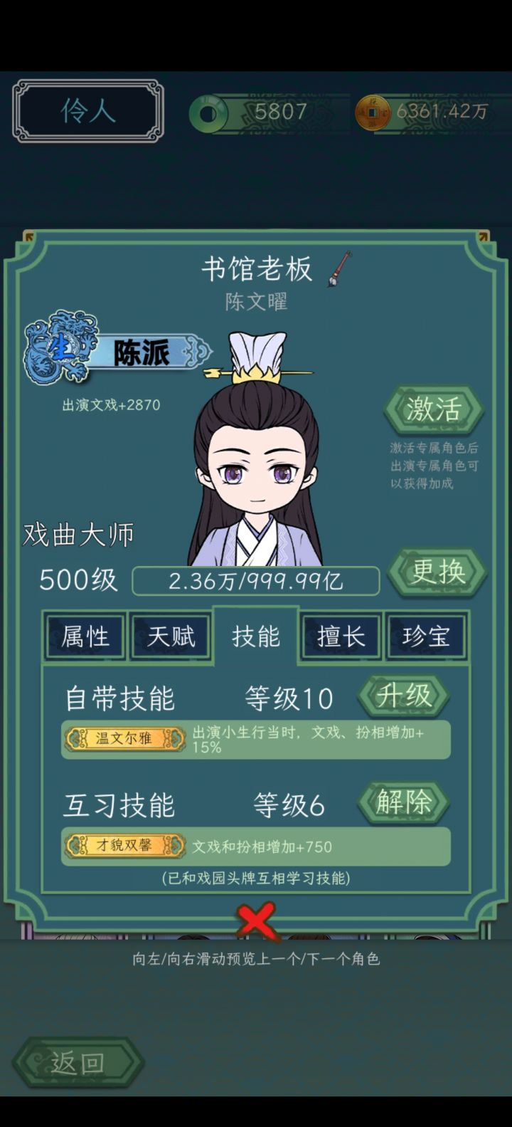 角色的属性取决于角色等级+珍宝等级,400级以后角色需要的经验直线上升且戏曲大师无法加入其他流派,紫色以下的角色停留在400级反而更好,正确的培养角色能节约不少资源和时间。角色是固定的,一共64个,不同品质的角色升级所需的经验相同,所以培养品质越高的成长越高的角色收益越高,以下是部分角色的成长及技能金色角色和金色以下的特技角色都可以练到400400以后值得练的就不多,这里推荐几个江南才子(