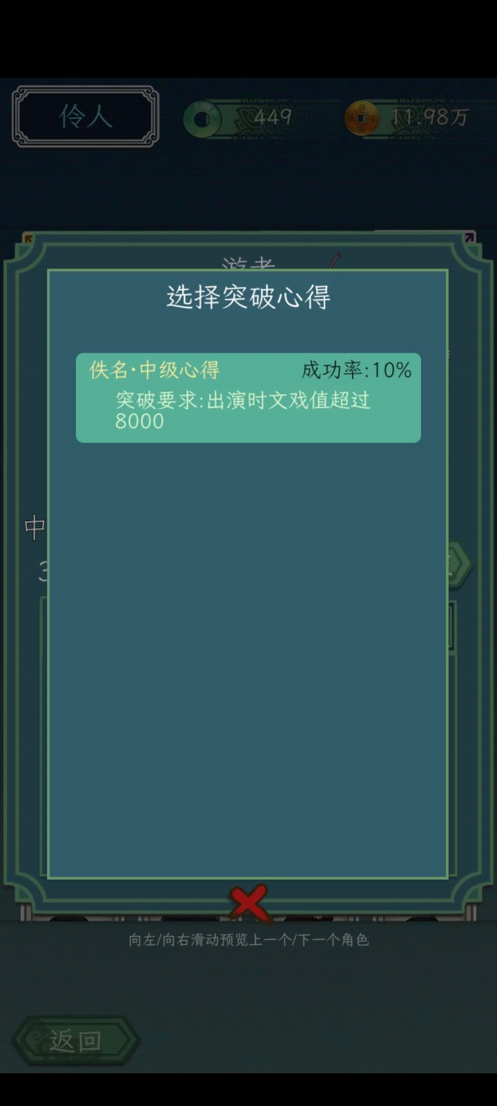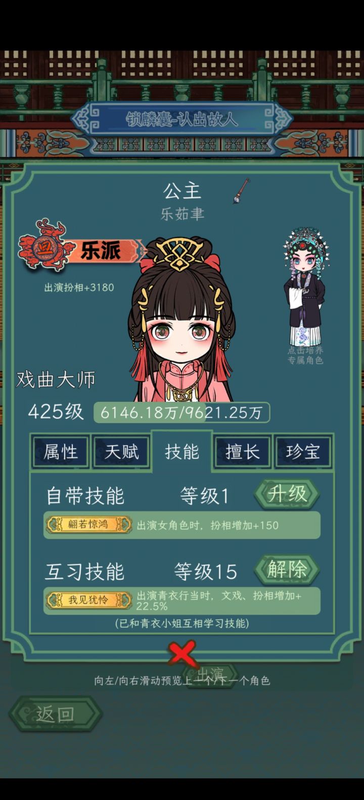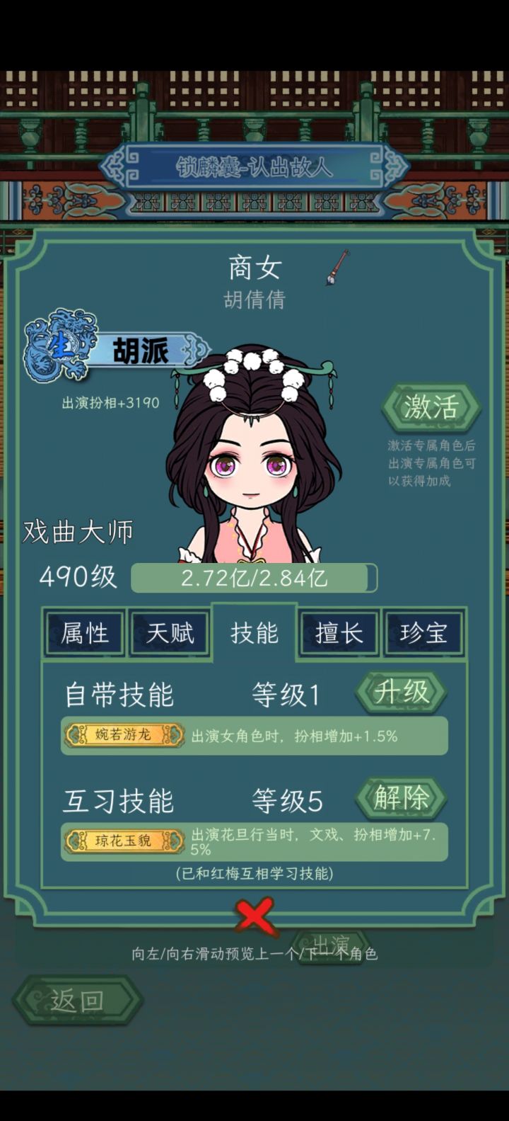伶人技能大抵分两种,一种是演固定角色加成,一种是直接属性加成拿花旦和青衣来说吧,这两小美女就是固定位置加成。很多人拿红梅和废材互学,这样这两个人既可以演青衣,又可以演花旦。妃子和师太同理,互学了以后,可演老旦可演彩旦。演出的时候其实只生效一条属性的,比如你红梅和青衣互学,青衣演花旦的位置,那她本身青衣的属性就不生效了,只生效花旦那条加成,所以我觉得有些浪费。现在的长剧本,不止一个青衣彩旦角