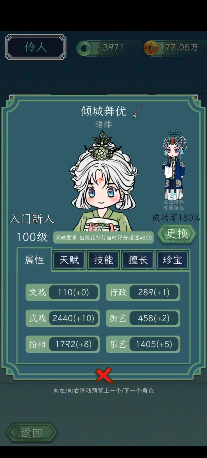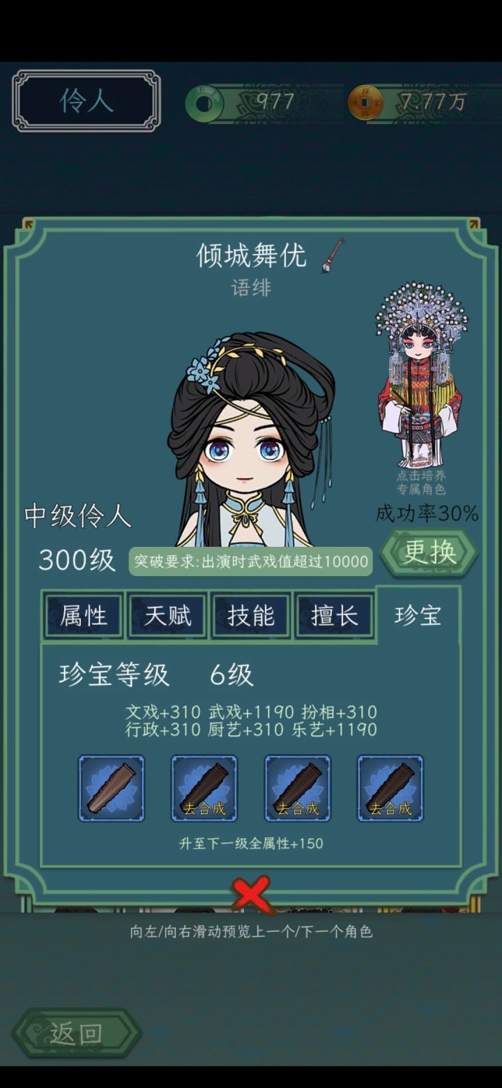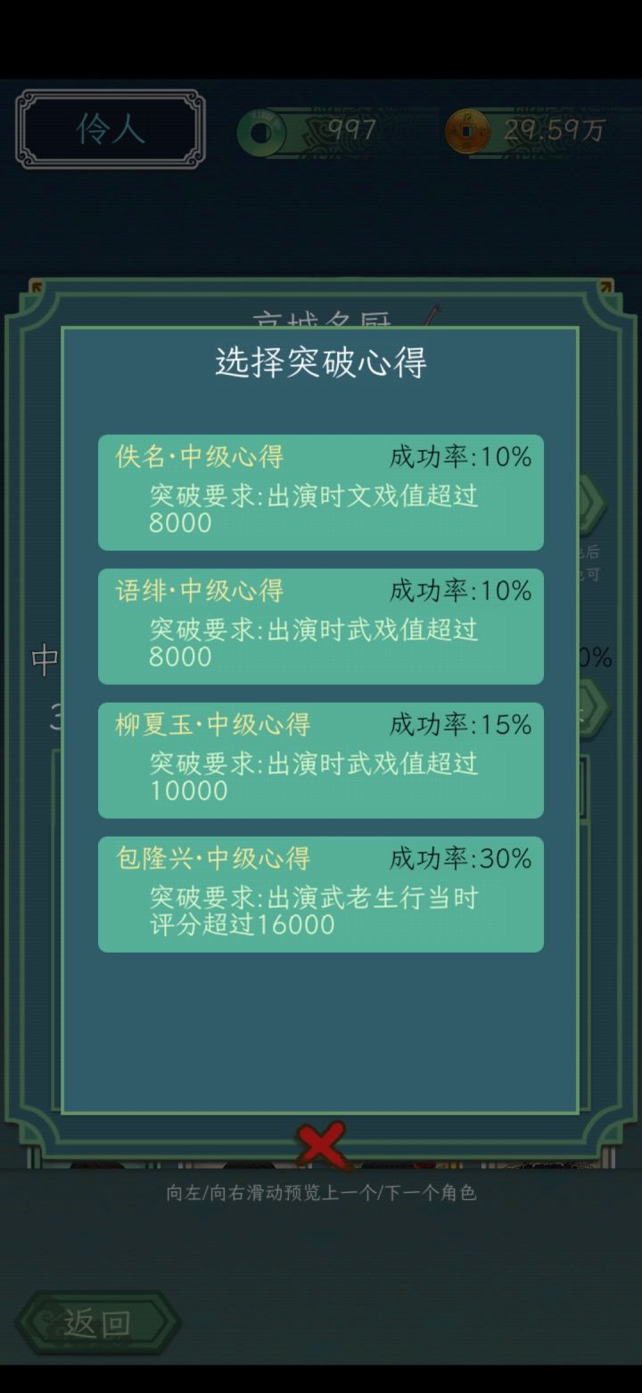 1.剧院武戏加成堆到10%2.自身珍宝技能堆到6级3.学习府学之女的紫色技能,堆到5级4.选对剧本,其他剧本有的到不了1w的以上就能过,语绯过了就是武戏8k的突破出现,那样退休老头,京城名厨俩金色都能过