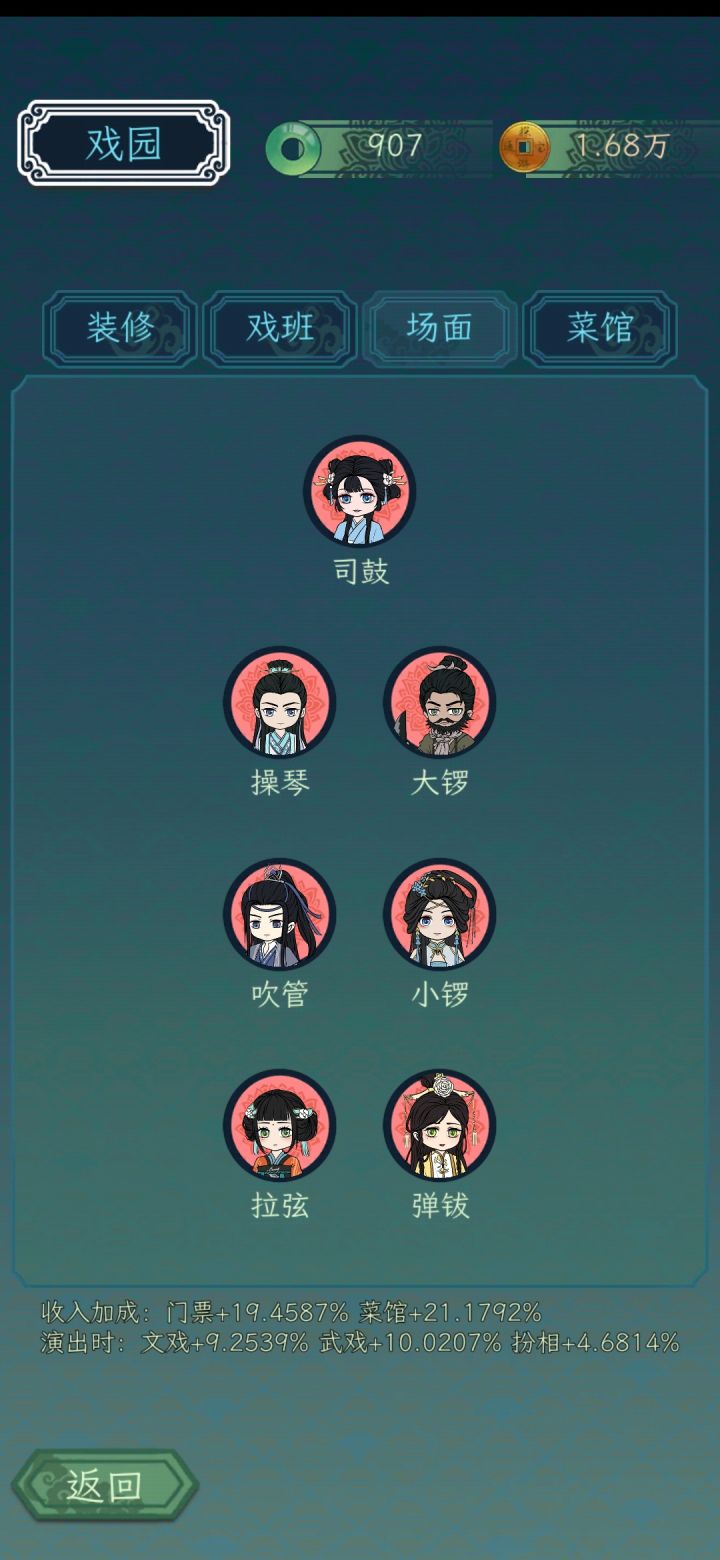 追求长剧本高收益的可以吃长剧本的专属,盯着一个剧本薅!!!基本都有专属,戏服目前是110/126。我很多没给衣服,剩下的可以看着给,现在剧本很多衣服都适配一堆人。霸王别姬(论坛搜霸王别姬伯仁有配图),项羽虞姬高属性就行。锁麟囊2个妹子主角占比高,其余都差不多占比,得上很多人。如果人不够还是建议霸王别姬,毕竟时间短,效率高。1.6又更了个长剧本拿高登,20伶人36分钟,武生终于有用武之地,具