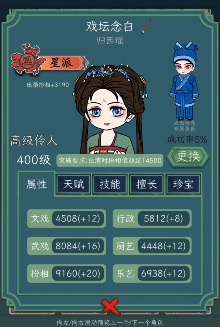 以下数值为角色满级满珍宝面板数值,纯手打可能存在偏差穷经秀才的扮相只差了前两位20,但这几位都不适合其他职位,因此穷经秀才就没必要大力培养了,纯粹是江南才子的下位替代行政属性五位带天赋的面板属性也是一骑绝尘,美男子可作为多个职位的过渡,还是值得培养一下的除了七位带天赋的角色外最高面板厨艺是逃荒妇女然而天赋只在加成上生效,在做菜时并不生效,因此目前最后一道菜是做不出来的戏园新人有很可观的乐