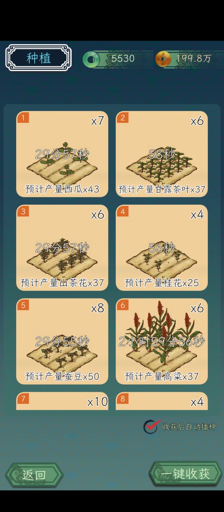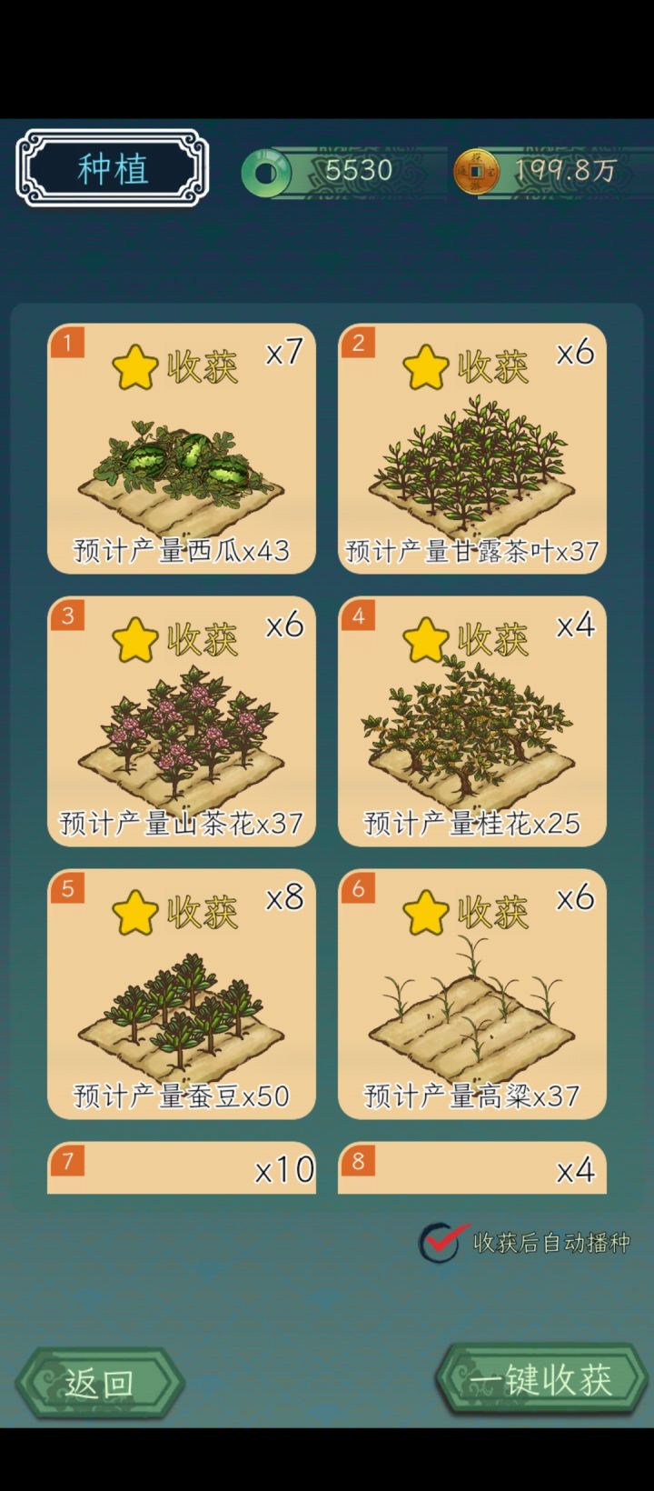 比如做菜失败后,再次做菜能自动出上次做菜的菜谱!比如种地里一键铲除和一键种植!真的好累啊种菜