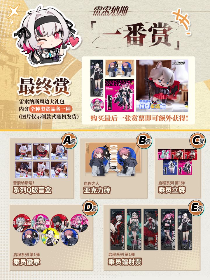 7月6日(周日)下午3点 雷索纳斯抖音官方号 将开启一番赏直播!━━\\赏品信息公布//━━共计5种赏品档位,超值大奖等你狂薅!!!赏品等级及盒内抽数:A赏 雷索纳斯喵!系列盲盒 6抽B赏 【启程之人】亚克力砖 5抽C赏 启程系列第1弹 乘员亚克力立牌 17抽D赏 启程系列第1弹 乘员徽章 22抽E赏 启程系列第1弹 乘员镭射票(包含两张:振五+精一) 33抽━━\\满赠信息//