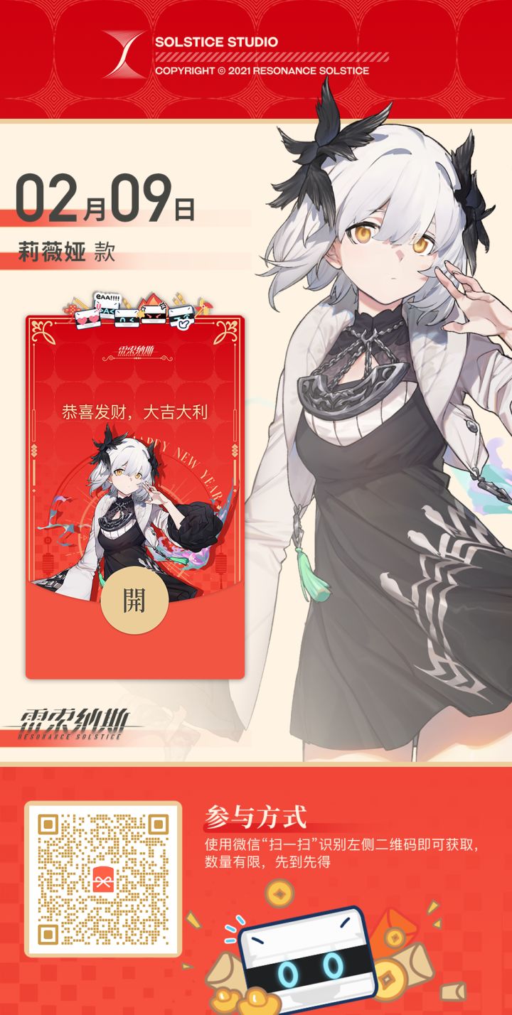 列车长,除夕快乐!《雷索纳斯》专属红包封面-「莉薇娅款」现已发放。关注@雷索纳斯 官方账号,明日12:00「那由他款」开启发放,不要错过!——————【预约方式】✦iOS预约:✦TapTap预约✦官方预约站:【联系我们】✦官方①群:738915435✦官方②群:810297570✦官方③群:785548786