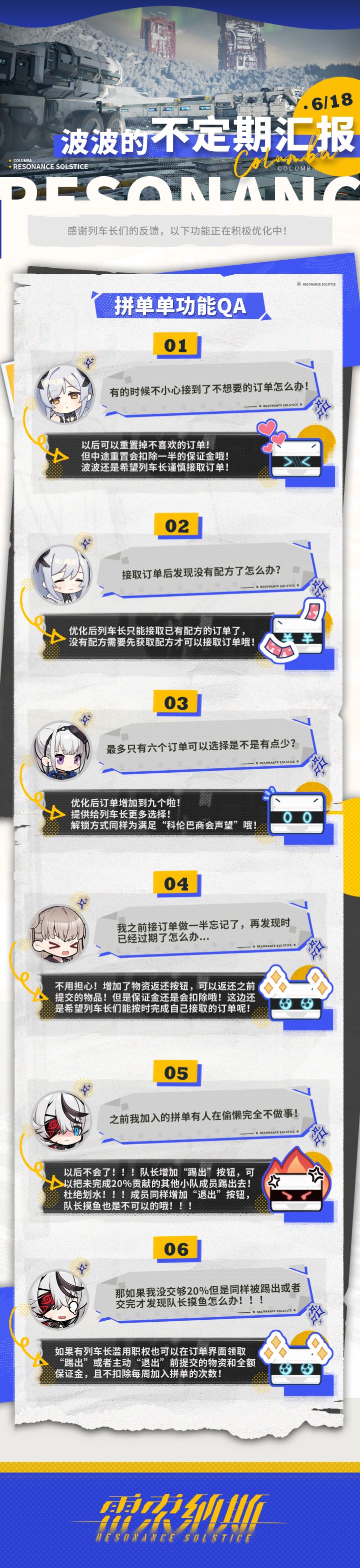 亲爱的列车长: 感谢您对《雷索纳斯》的关注与支持,我们将于今日对以下内容进行更新,为此带来的不便波波向您致歉!更新形式:不停机更新更新补偿:仙人掌能量棒棒糖*2、提神棒棒糖*1▌新增内容1. 乘员招募轮换【常驻招募】SSR 那由他 6月20日更新后 - 6月30日 12:00【常驻招募】SSR 妮蔻拉 6月20日更新后 - 6月30日 12:002. 履历礼包那由他的履历礼包妮