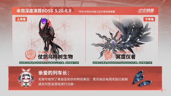 「虚演刻录·深度演算」BOSS上半场:仗剑乌桦树生物下半场:冥霆仪者本周黑月商店货物及异构厄枝已刷新,请列车长及时登录游戏进行查看~#雷索纳斯 ——————————✦官方交流2群 :810297570✦官方交流3群 :785548786✦官方交流4群 :955539203