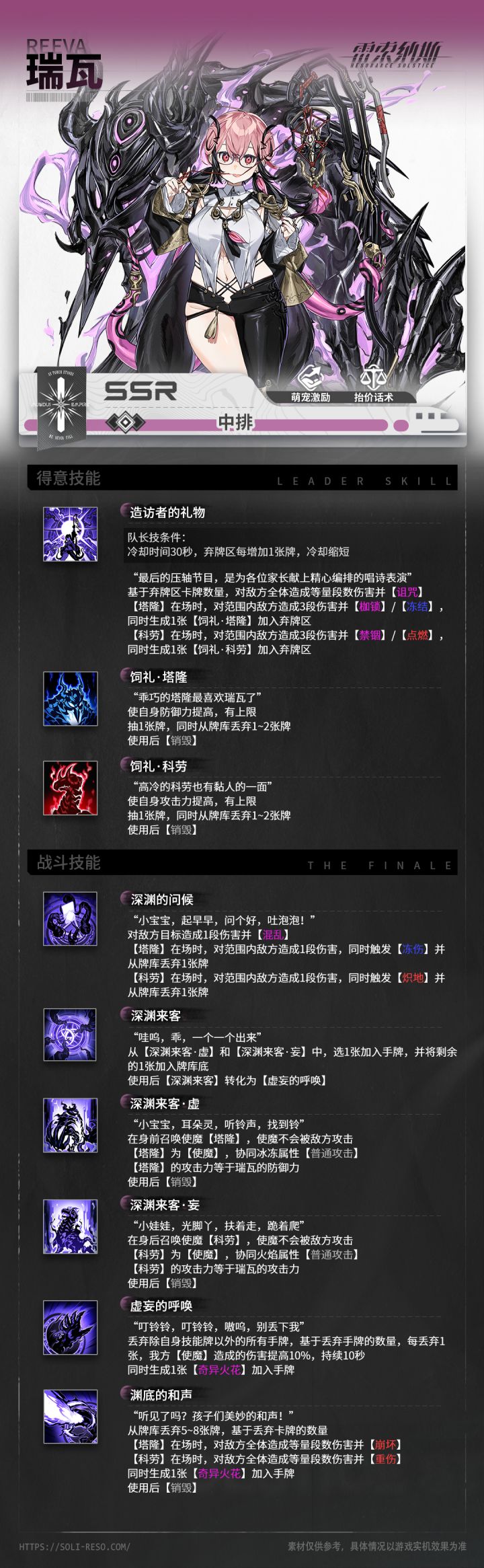 亲爱的列车长: 感谢您对《雷索纳斯》的关注与支持,我们将于今日对以下内容进行更新,为此带来的不便波波向您致歉!▌卡池相关【专列招募】起止时间:5月29日 更新后-6月19日 12:00招募说明:以下乘员获得概率提升SSR 瑞瓦▌新增内容1、瑞瓦个人逸闻剧情2、“恶魔猎人”乘员履历礼包3、“恶魔猎人”乘员招募礼包4、“恶魔猎人”乘员精选招募礼包5、“恶魔猎人”乘员至臻招募礼包