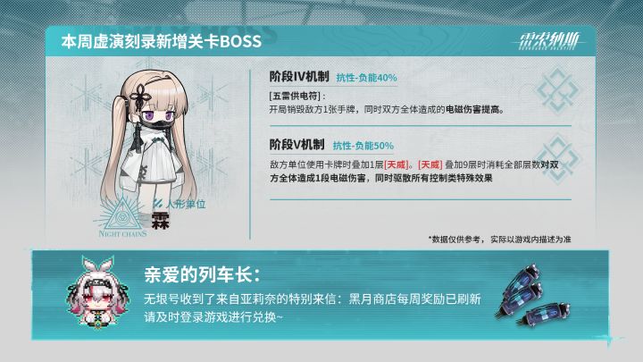 「虚演刻录」BOSS:霖本周黑月商店货物及异构厄枝已刷新,请列车长及时登录游戏进行查看~#雷索纳斯 ——————————✦官方交流2群 :810297570✦官方交流3群 :785548786✦官方交流4群 :955539203