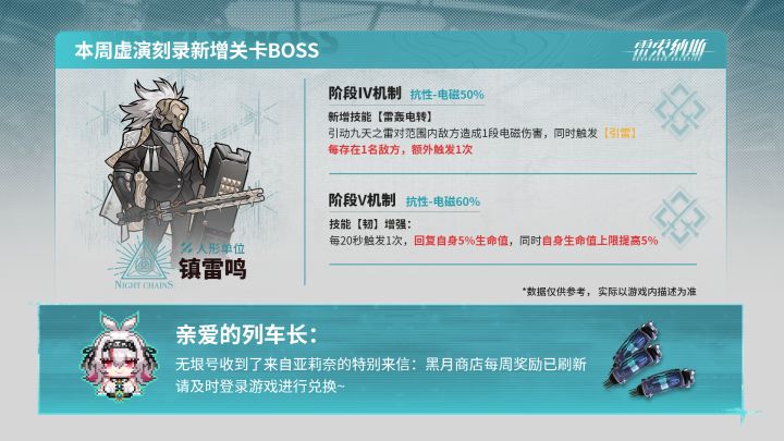 「虚演刻录」新增BOSS:镇雷鸣本周黑月商店货物及异构厄枝已刷新,请列车长及时登录游戏进行查看~#雷索纳斯 #雷索纳斯一周年 ——————————✦官方交流2群 :810297570✦官方交流3群 :785548786✦官方交流4群 :955539203