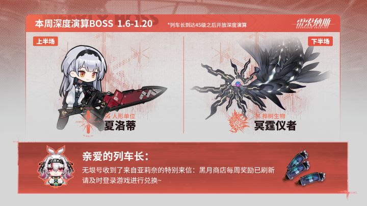 「虚演刻录·深度演算」新增BOSS上半场:夏洛蒂下半场:冥霆仪者本周黑月商店货物及异构厄枝已刷新,请列车长及时登录游戏进行查看~#雷索纳斯 ——————————✦官方交流2群 :810297570✦官方交流3群 :785548786✦官方交流4群 :955539203