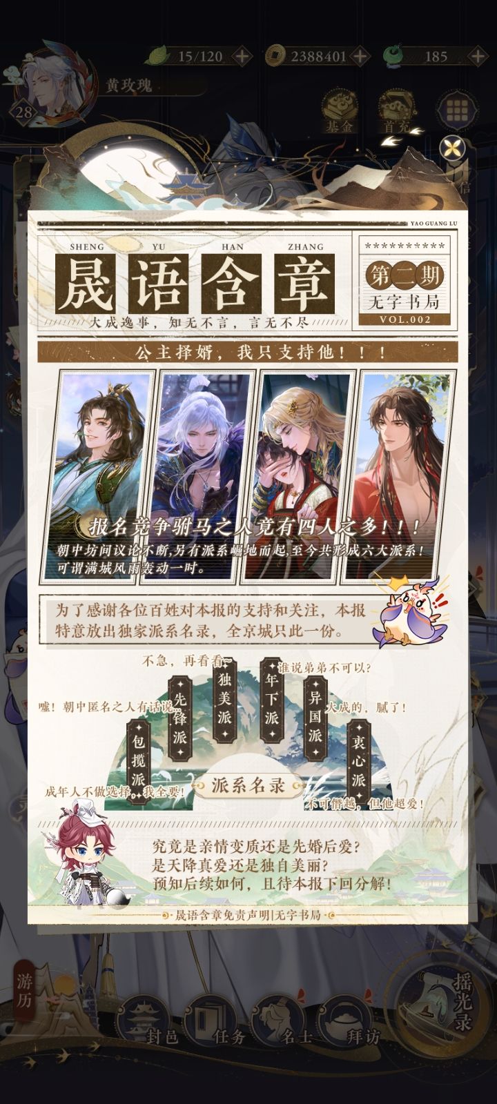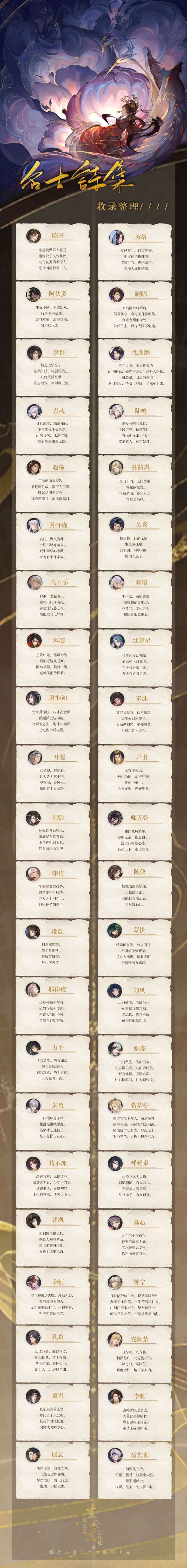 公主殿下日安,今日奉上截至2023.9.17已公布的全名士个人诗和心语诗汇总。 名士个人诗可通过游戏内【拜访】页面选择名士,并点击【传记】查看。心语诗可通过包裹内的心语界面,再点击对应名士心语查看。 “流水行云才思,光风霁月精神。”希望本期内容能够帮助公主殿下更好的了解名士~另外,此前已发布的名士相关信息汇总类攻略,本组已将新名士相关的补充更新提上日程,敬请期待。#攻略#游戏安利#摇光录:乱世公主