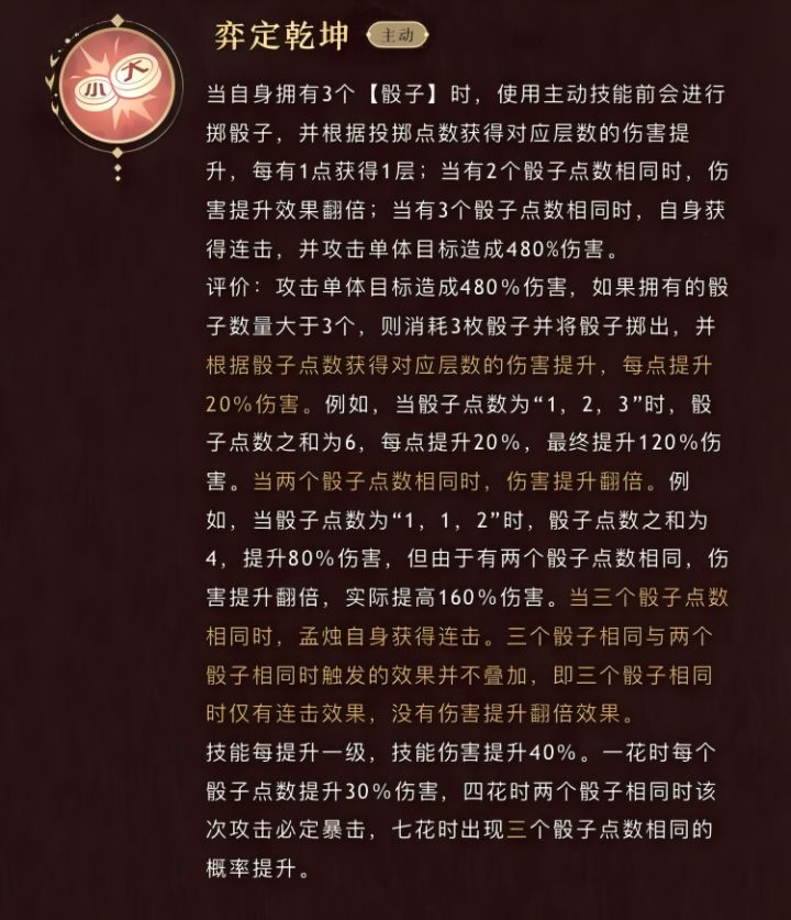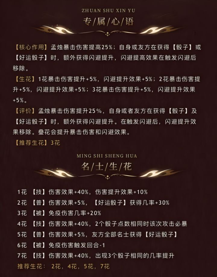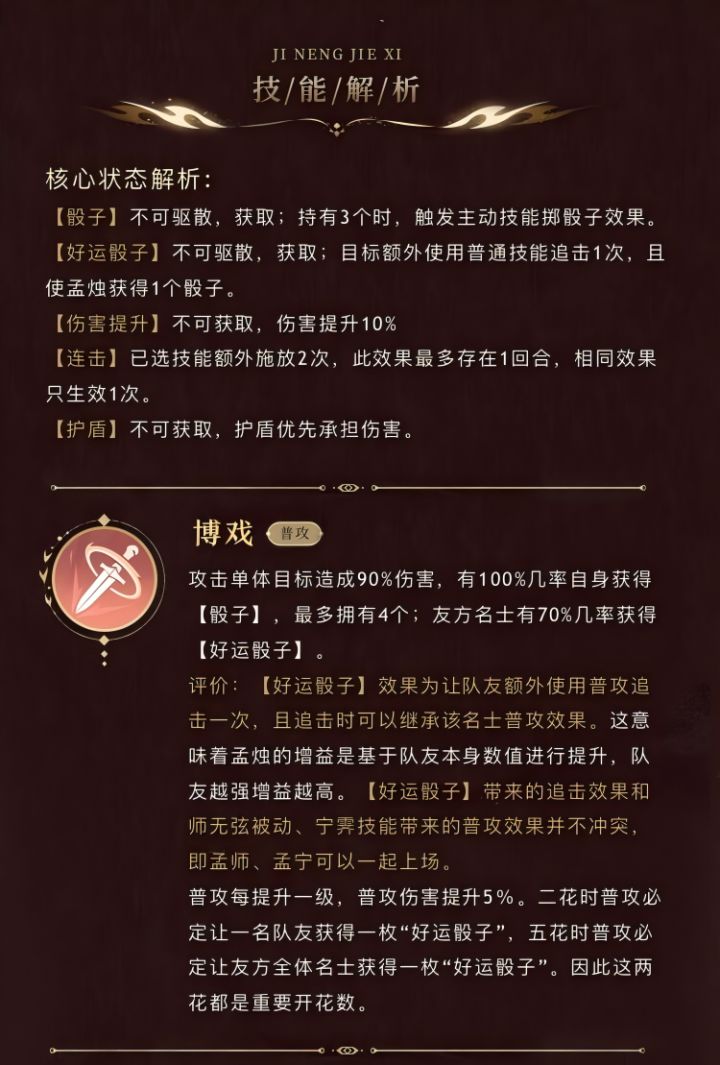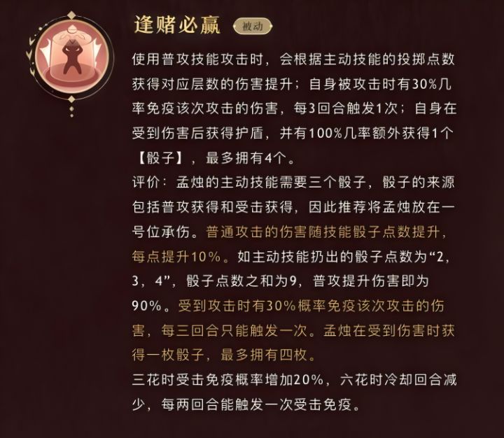 公主殿下日安,奉上孟烛测评。完整文字内容详见长图~ ▷省流总结版 孟烛是一名日属性名士,具备高额伤害和自保能力。他的技能包括普攻“博戏”,对敌方单体造成伤害并获得骰子,增加伤害的同时提供额外战斗效果;主动技能“弈定乾坤”,通过投掷骰子根据点数造成伤害,并有机会获得额外伤害增益,确保了伤害的稳定性和爆发力;被动技能“逢赌必赢”,在受攻击时有几率免疫伤害,同时普攻技能根据“骰子投掷”的点数获得额外