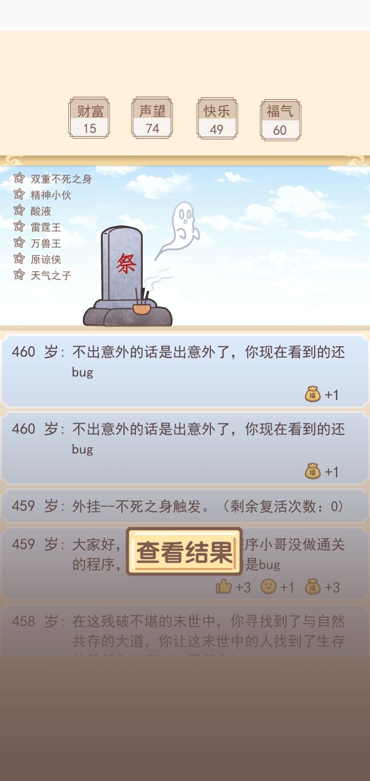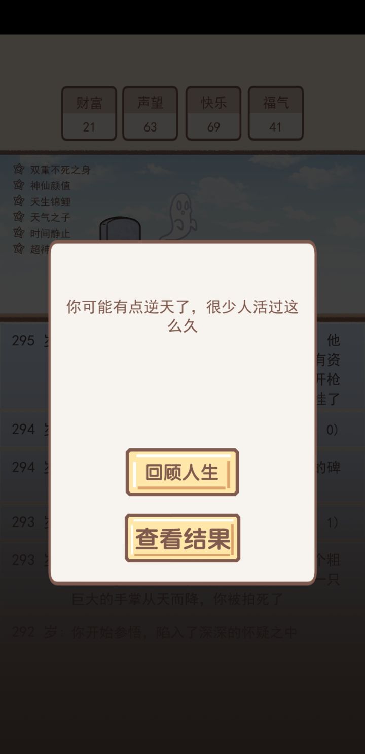 在一百岁前必定会死几次,到100岁后会遇到神秘人,这时候会出现三种情况:修仙、移民火星、在丧尸横行的末世生存(选择之后的路线除了不死之身外感觉其他外挂都没用了)