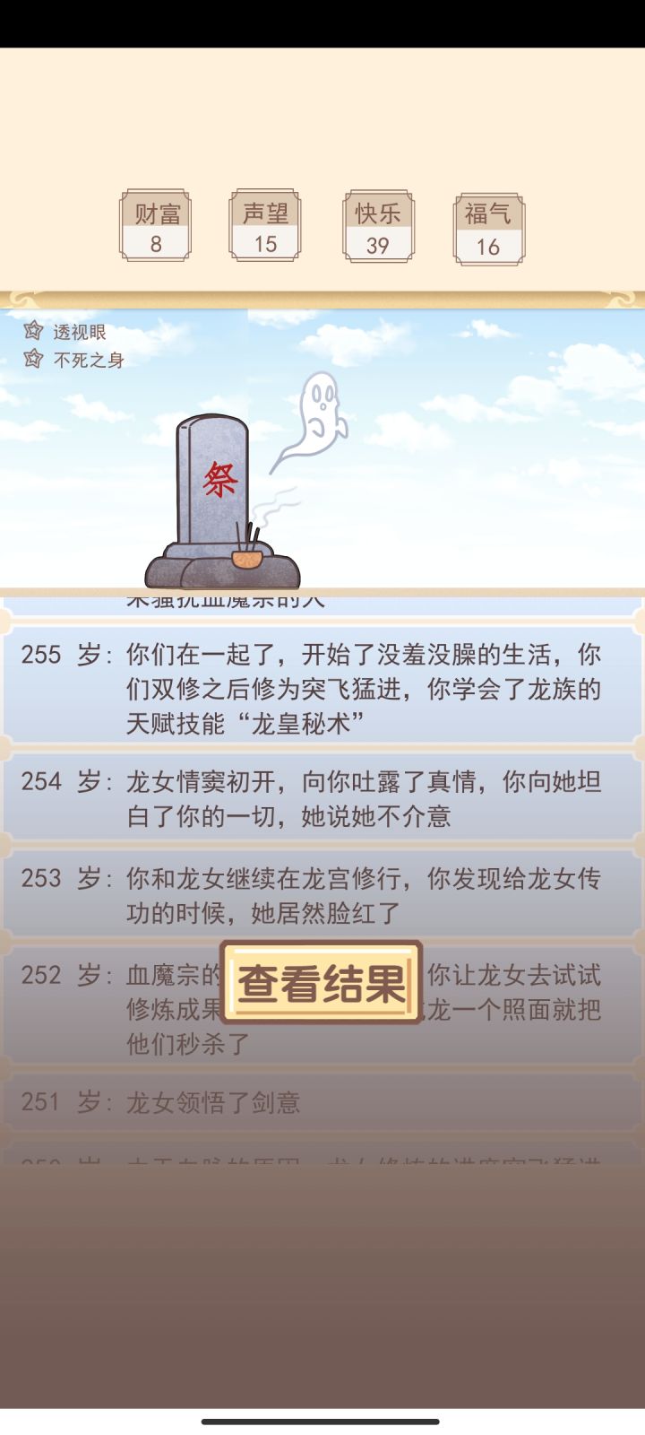 正常修仙:最开始要突破先选压制,后面看到猿猴选打坐,遇到二郎神和血魔的话选择相信血魔,遇到酿酒选择用法力催熟(用防腐剂会把自己毒死),目前最多活到290多岁(修仙路线突破不了界碑)