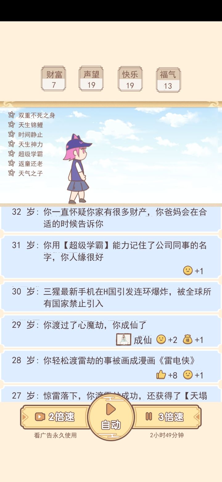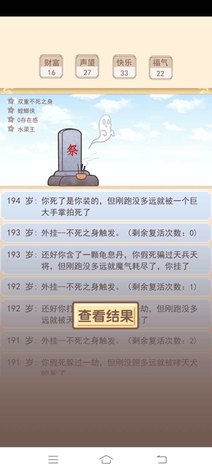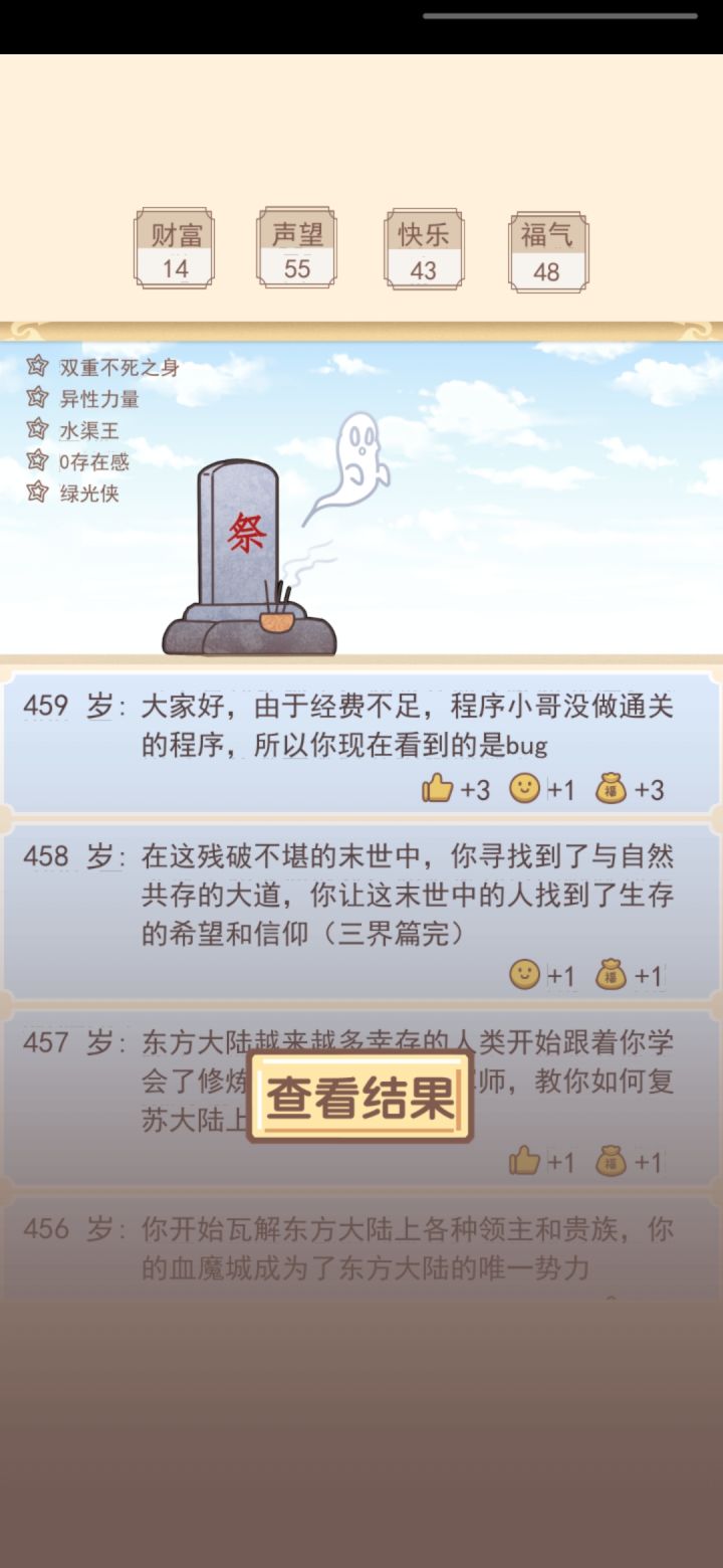玩了一个三界篇结局,活到400多岁吧没截图的我很伤心啊😢带了双重不死之身,天气之子活到100多岁遇见黑衣人,暗红色修了魔随便选的,反正选错了,还有复活有点废时间,玩完一个结局就不想再玩了,而且挂也不多,能用的也没几个,就复活还有点大用,别的都没什么用天气之子还能再桃花源控制控制天气别的真就是废的,没耐心了,算了不玩了