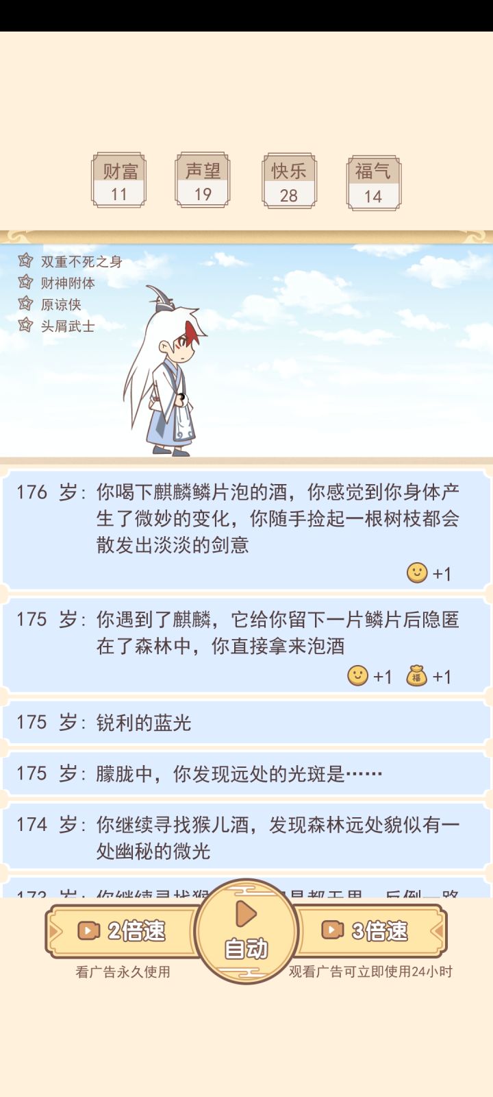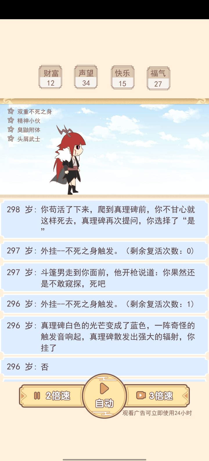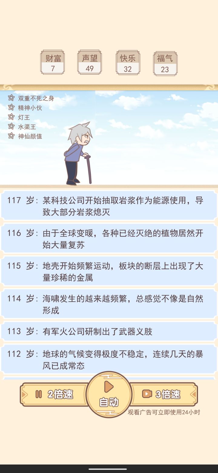 玩了一个三界篇结局,活到400多岁吧没截图的我很伤心啊😢带了双重不死之身,天气之子活到100多岁遇见黑衣人,暗红色修了魔随便选的,反正选错了,还有复活有点废时间,玩完一个结局就不想再玩了,而且挂也不多,能用的也没几个,就复活还有点大用,别的都没什么用天气之子还能再桃花源控制控制天气别的真就是废的,没耐心了,算了不玩了
