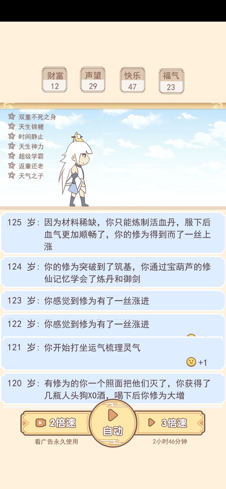 29成仙,124筑基是吧?还有成仙了过不过80岁是吧?要不是有不死之身,成仙后还是80就会死