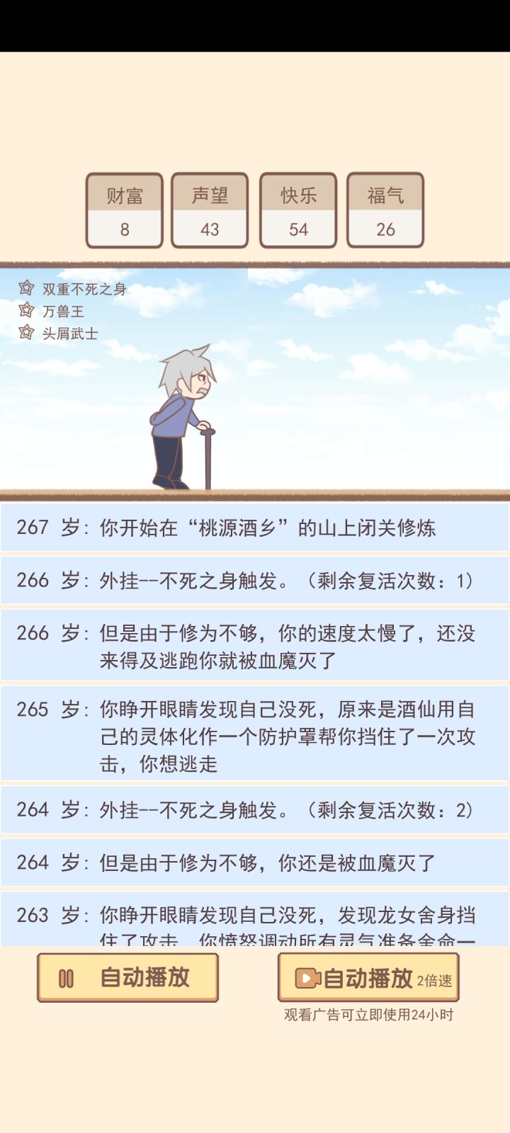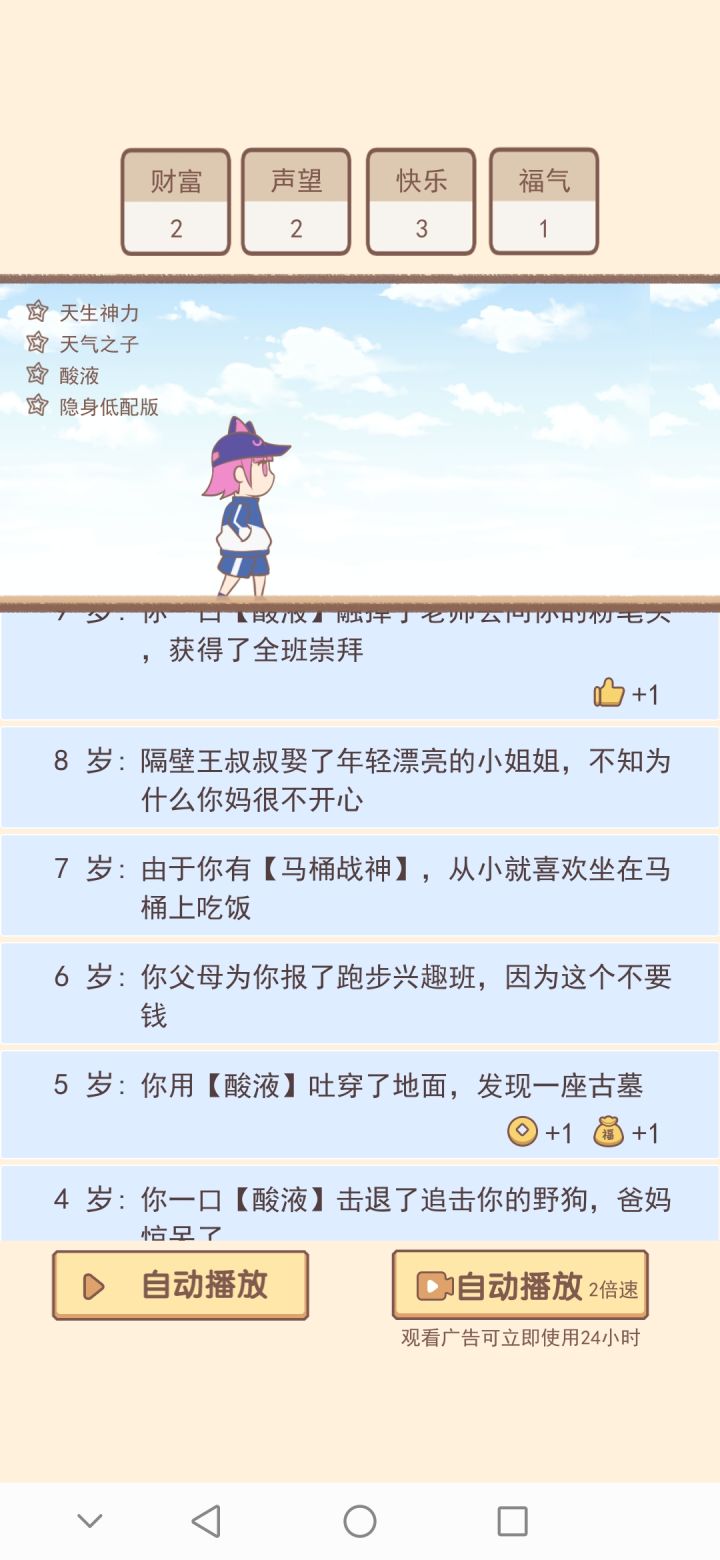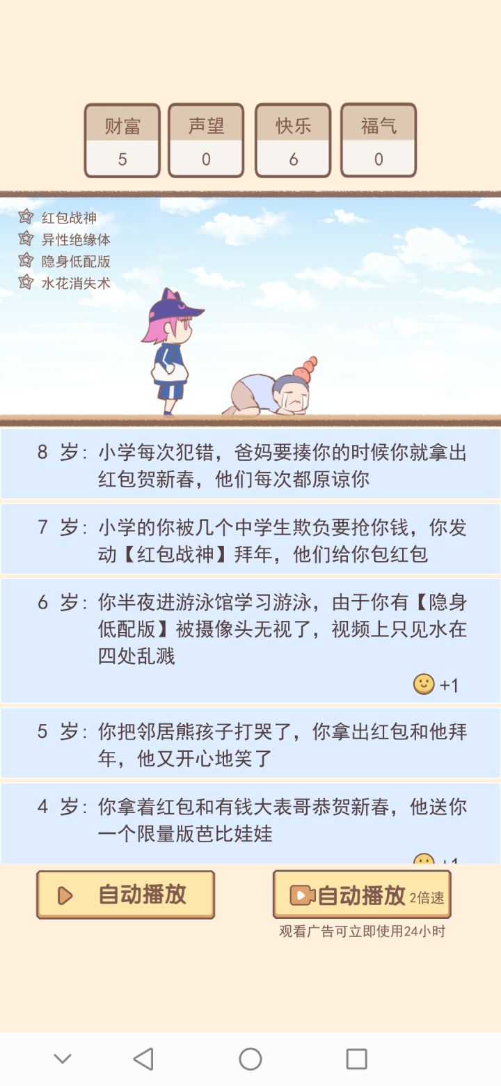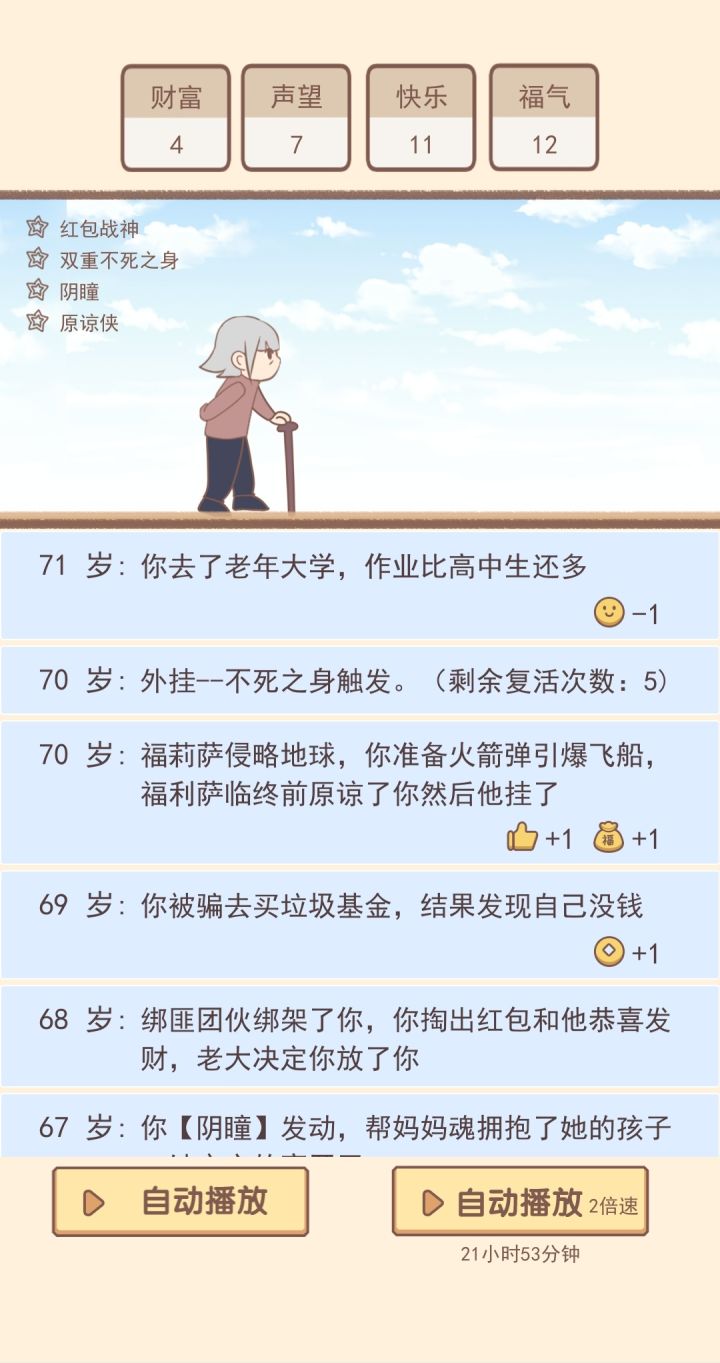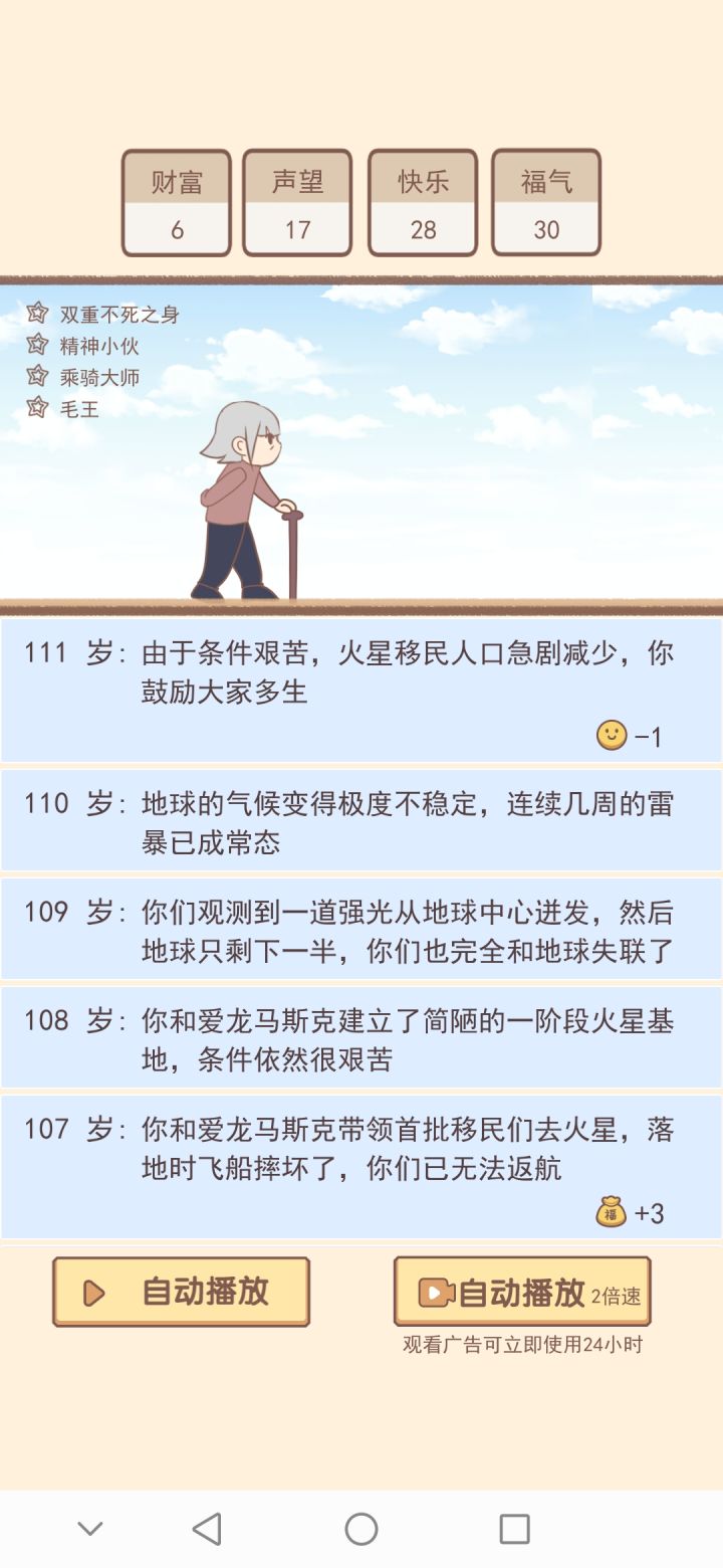 各种事件很有趣,但这个速度就不能快一点吗?那怕就是我看广告开两倍速都慢的不行,之前好不容易搞了修仙路线结果用了半个多小时才弄到了二十几分福气(这里面的福气基本都是像黑客之神这种帮政府才有那么一两点)时间长流程慢回报低,我看一个广告才减少25的升级需求,可每次想增加一个可选外挂数量就要看七八个广告。建议各位耐心不好的可以放弃了,这个比人生模拟器要好一些。但时间时硬伤😅个人觉得如果可以增加更多比如四倍速,八倍速可能体验要好很多。(纯属个人观点,每个人体验不同勿喷)