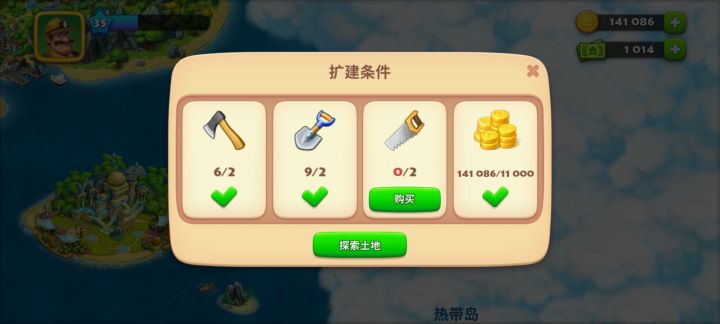 当该小镇达到第35级后,在水果岛的东北部有一座岛屿叫橄榄岛可供我探索,但是我在探索橄榄岛之前,还需要一些条件是:两把斧头、两把铲子、两把锯子和11000个金币。不过我还需要说明的是,为什么我上次解锁水果岛的时候,不用这些工具和金币就能立即解锁水果岛呢?#梦想城镇 #模拟经营