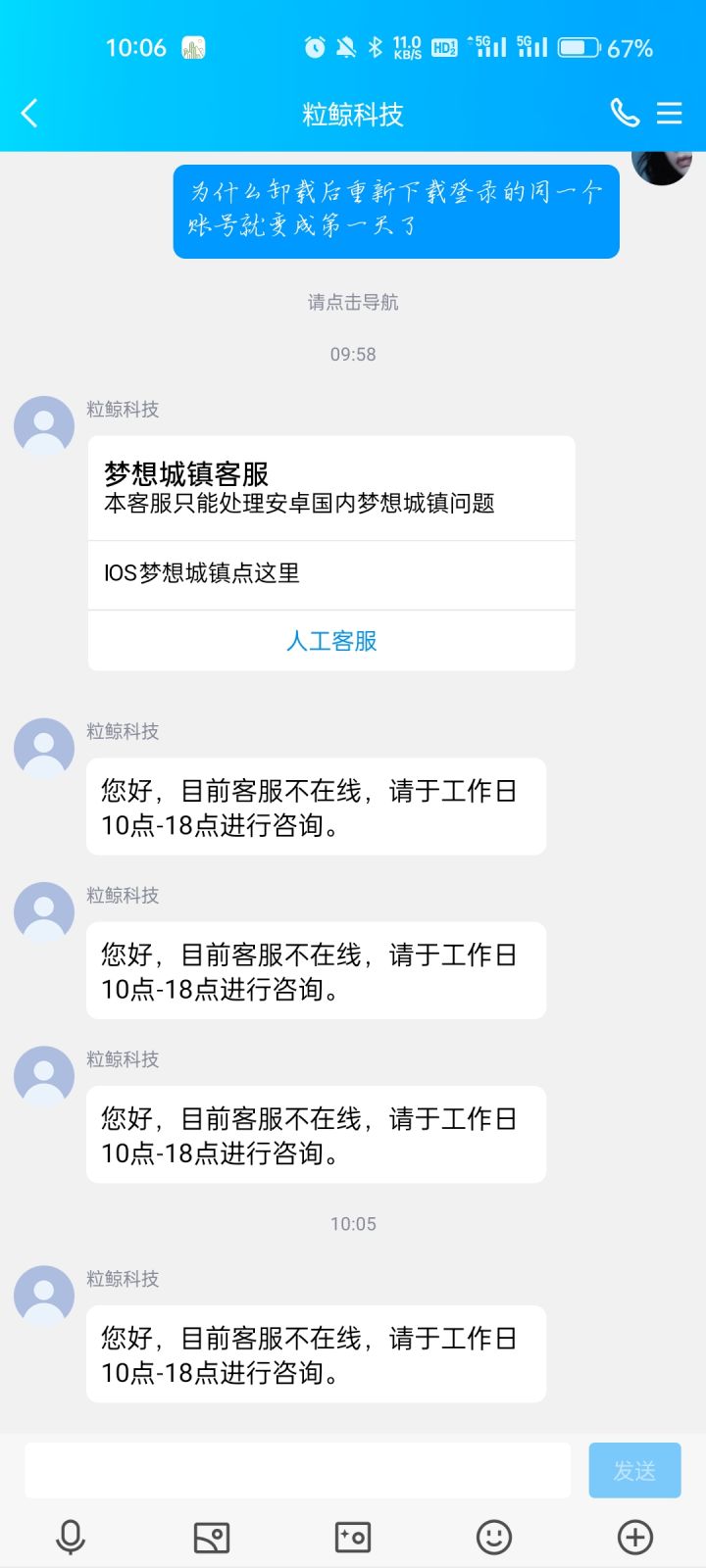 从昨天开始每次打开都是这样,正在加载,一直加载不出来。网络正常,甚至还卸载重装,手机重启都不行甚至出现了我昨天飞机发走,农作物都已经收完,今天上去发现昨天发走的飞机又回来还变空了,种的东西和我最后一次登游戏种的排列方式不一样。像是游戏进度没有储存上一样。直升机飞机火车都可以正常打开。动物园,黄金券,赛舟会,消息界面统统打不开。#休闲游戏#梦想城镇#bug反馈
