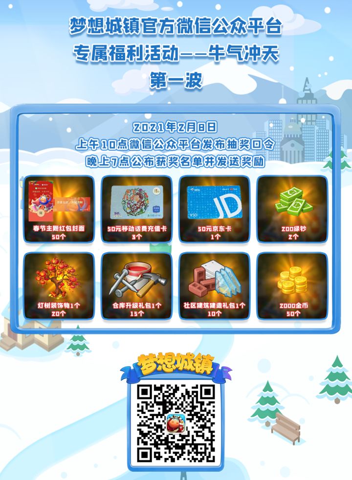 官方微信公众平台专属【牛气冲天】福利活动第一波开启啦!快来关注官方微信公众平台:梦想城镇手游(mxczsy)参与活动,回复关键词“第一波”即可获得活动口令,快来赢取梦想城镇专属微信红包封面、京东卡、绿钞、装饰物等奖励吧!