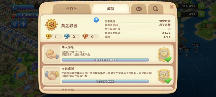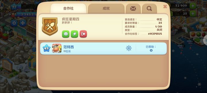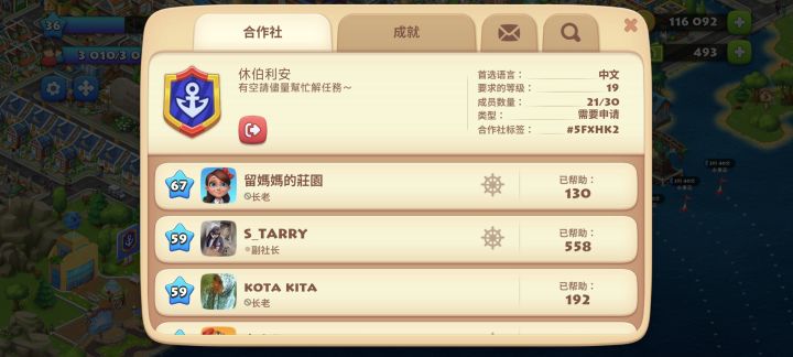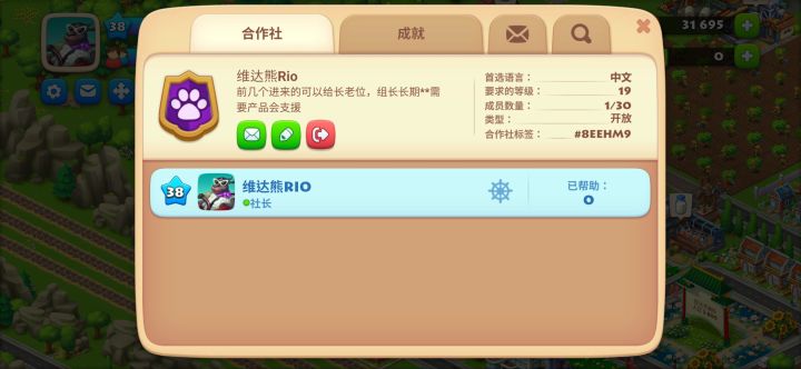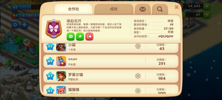 #梦想城镇 这个游戏好久没玩儿了,下回来发现合作社没人啦,我的活跃度比较高,基本上白天平均两个小时上线一次,因为要参加赛舟会或者平时装装箱子啥的,所以需要每天都上线的队友,不卷不卷,几个人一起做任务总比我一个人强。欢迎大家加入!!!