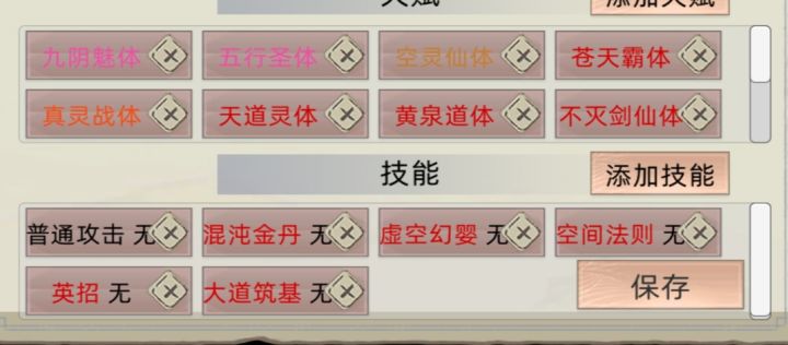 这是目前自定义角色我感觉我能配出来最强的 有小萌新可以抄一下 紫色天赋有兴趣可以换一下。黄泉可以换佛体 橙色的星轨也可以换 十象之力和天生神力没什么区别 女修是比男修多一个媚体的 要在演武场打一下基本就是女打男 剩下的我忘了 灵根即便是五灵根 这一套也是有嗯,我忘了反正资质不会差