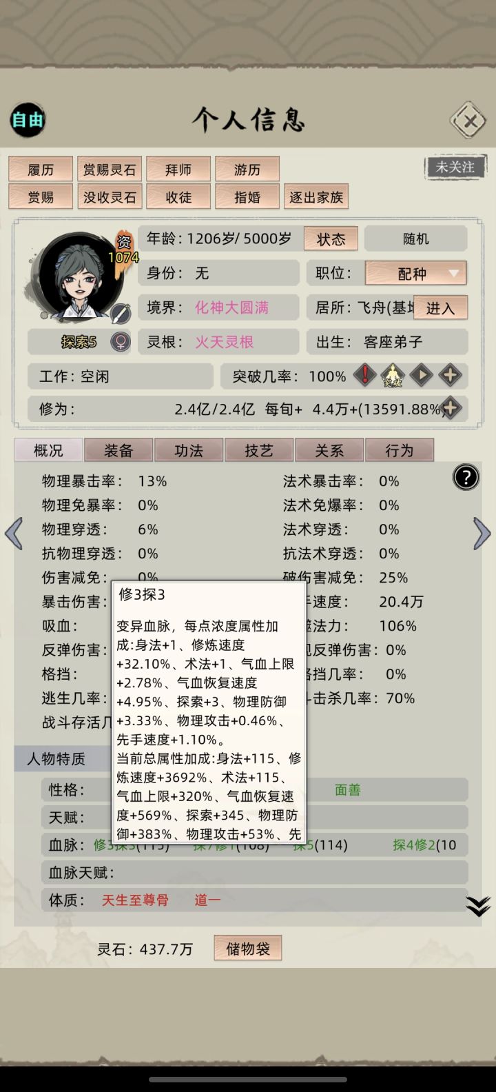 9探索+32修炼速度,配合老版本多倍激活bug,灵血多到用不完,桀桀生产属性理论上限是21条全中,且都是+2,每1点血脉浓度共计+42生产属性,116血脉浓度可达4872,配上3倍激活bug为14616