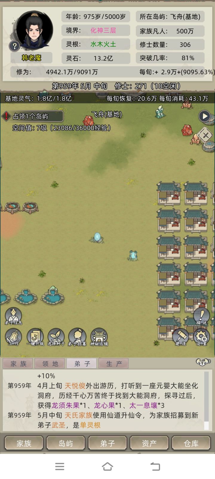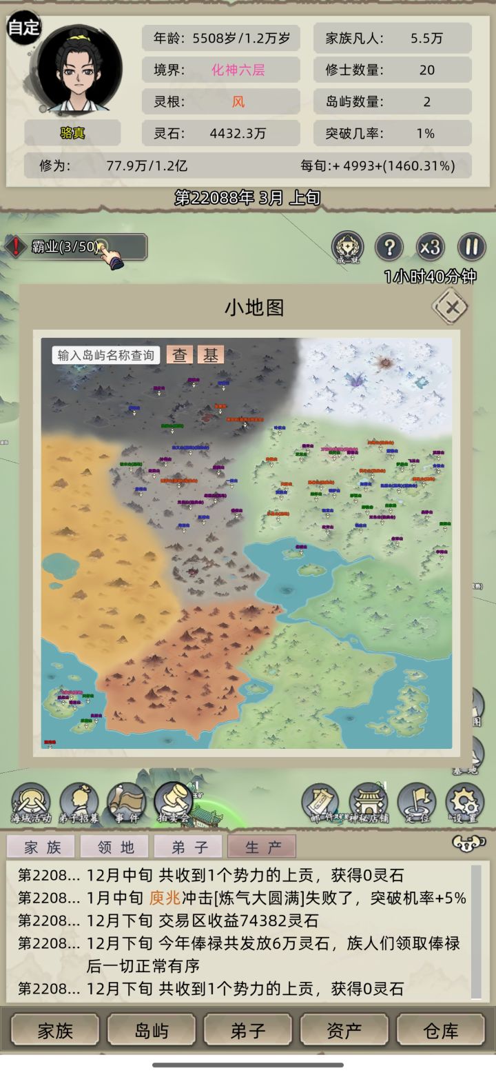 两2万多年了,被从中州赶到了最边上的小岛上,开局带的升仙台什么的法宝全部都被抢走了,第1个档,因为灵脉不够,升不到练虚,然后岛又被抢了,然后我在第2个岛升到6阶下品了,也快要能升到七阶下品了,结果又被抢了,被赶到边上之后。我学聪明了我升级了。混沌珠里面的灵脉,这样被抢也不怕了。升级是升级了,但是现在没有化神大圆满了,老祖和老祖的儿子,两个化神大圆满都已经死掉了。我应该能马上把属于我的东西抢回来了