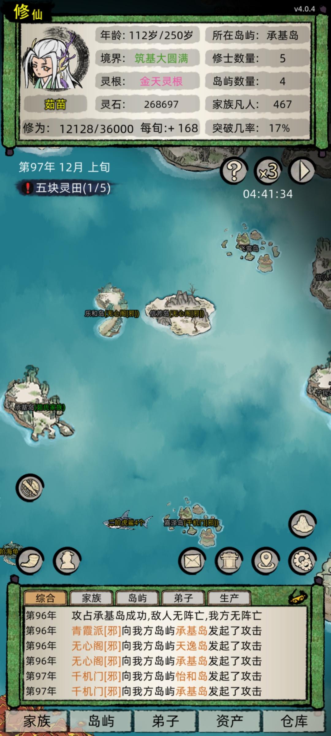 现在这个版本太🐮了,我老存档化身后期老祖随便杀着玩一更新游戏一个无名小派莫名的起来了两百多个岛两千多名修士现在无处可跑了打不过一对一还行,电脑不讲武德!还在跑路中