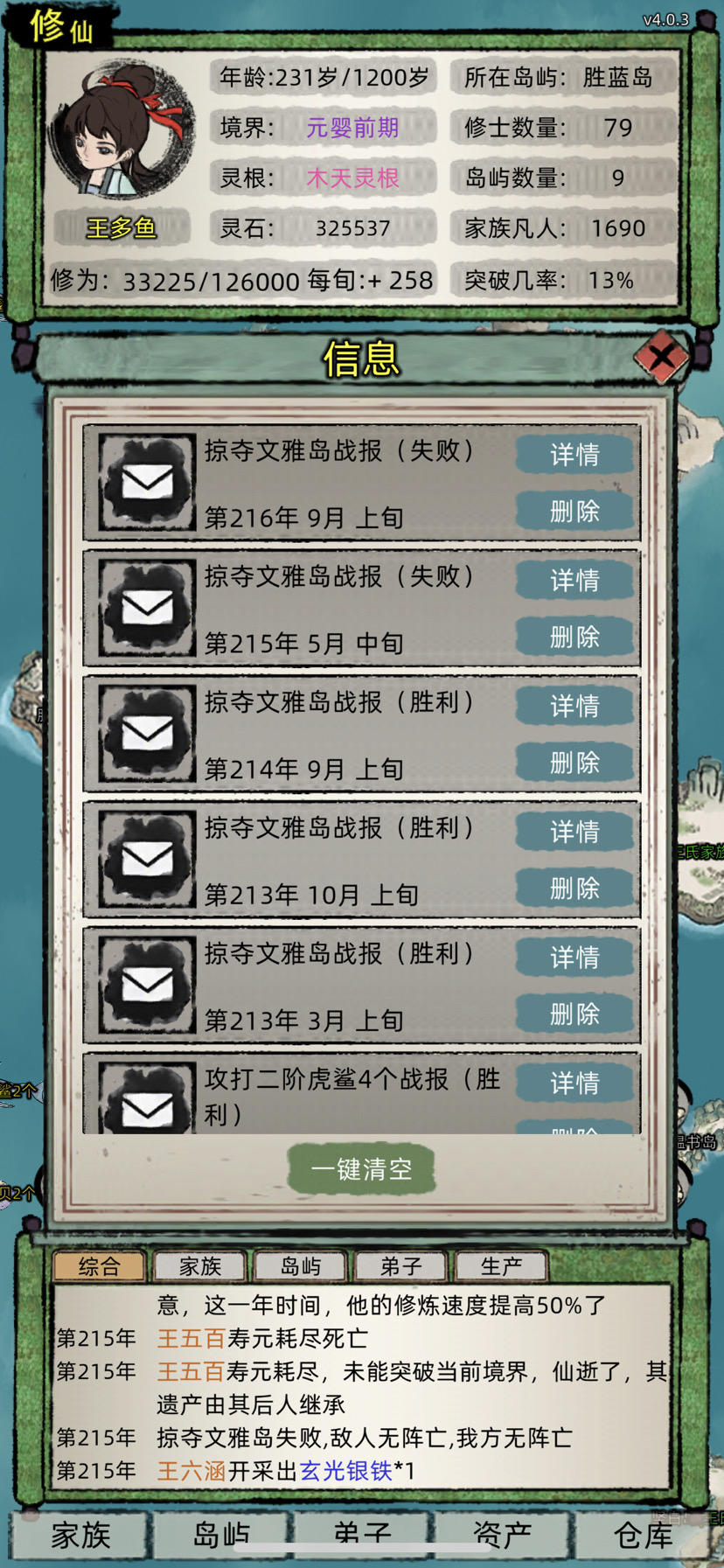 元婴老祖刚刚出山 打一个元婴岛屿 都看了就一中型门派一个元婴的 抢了三次没什么屁事 第四次抢就失败了 我以为是我血太少了 加满血在抢一次还是失败 结果一看突然多了1个化神出来 门派直接变巨型 真坑