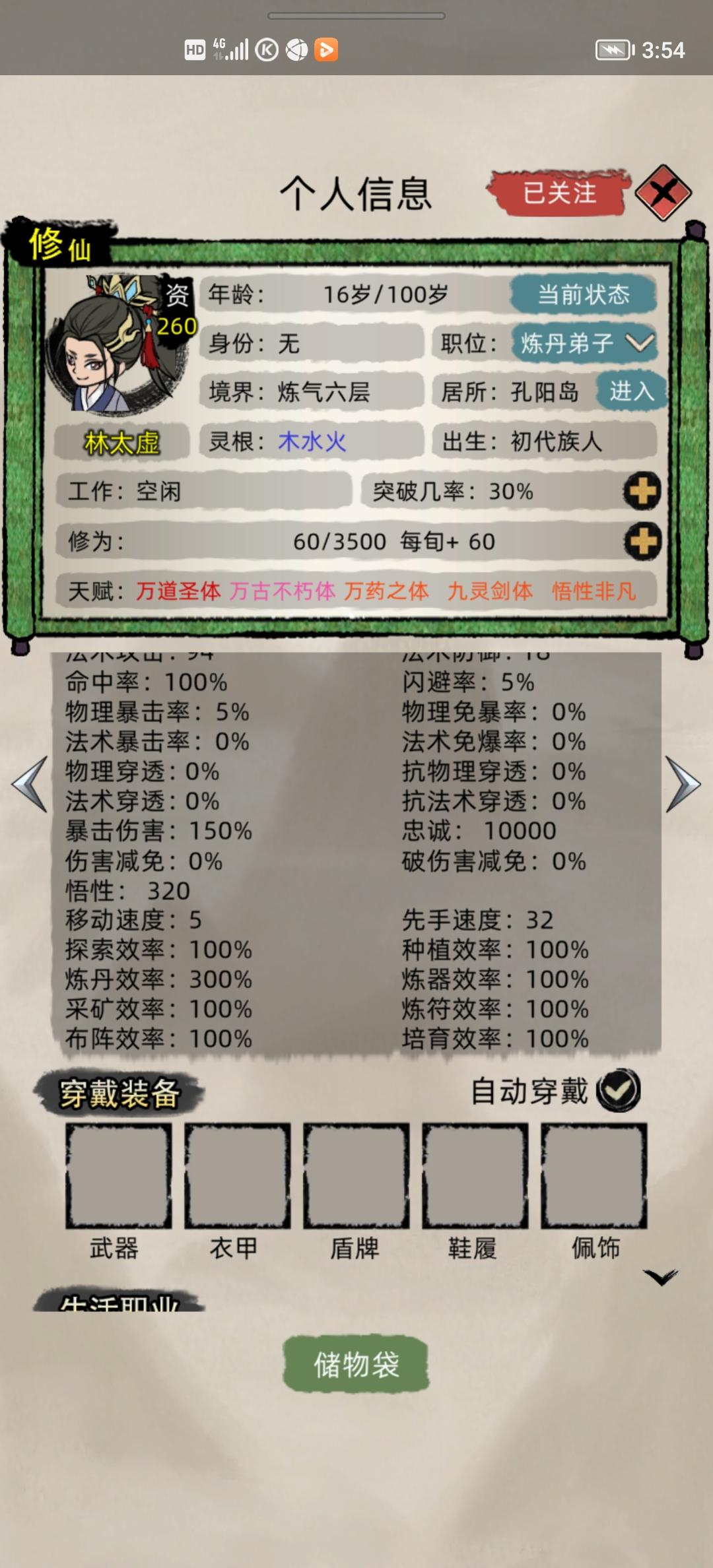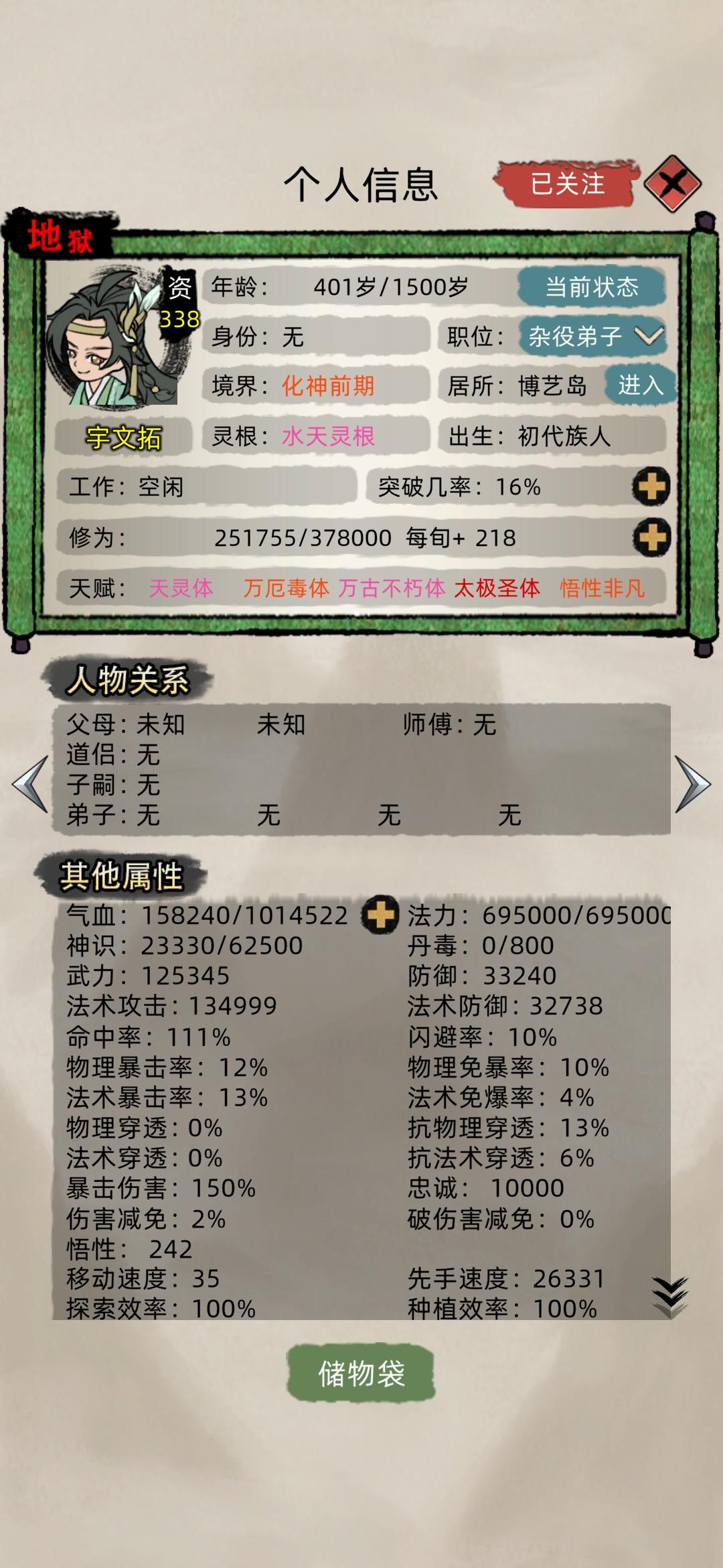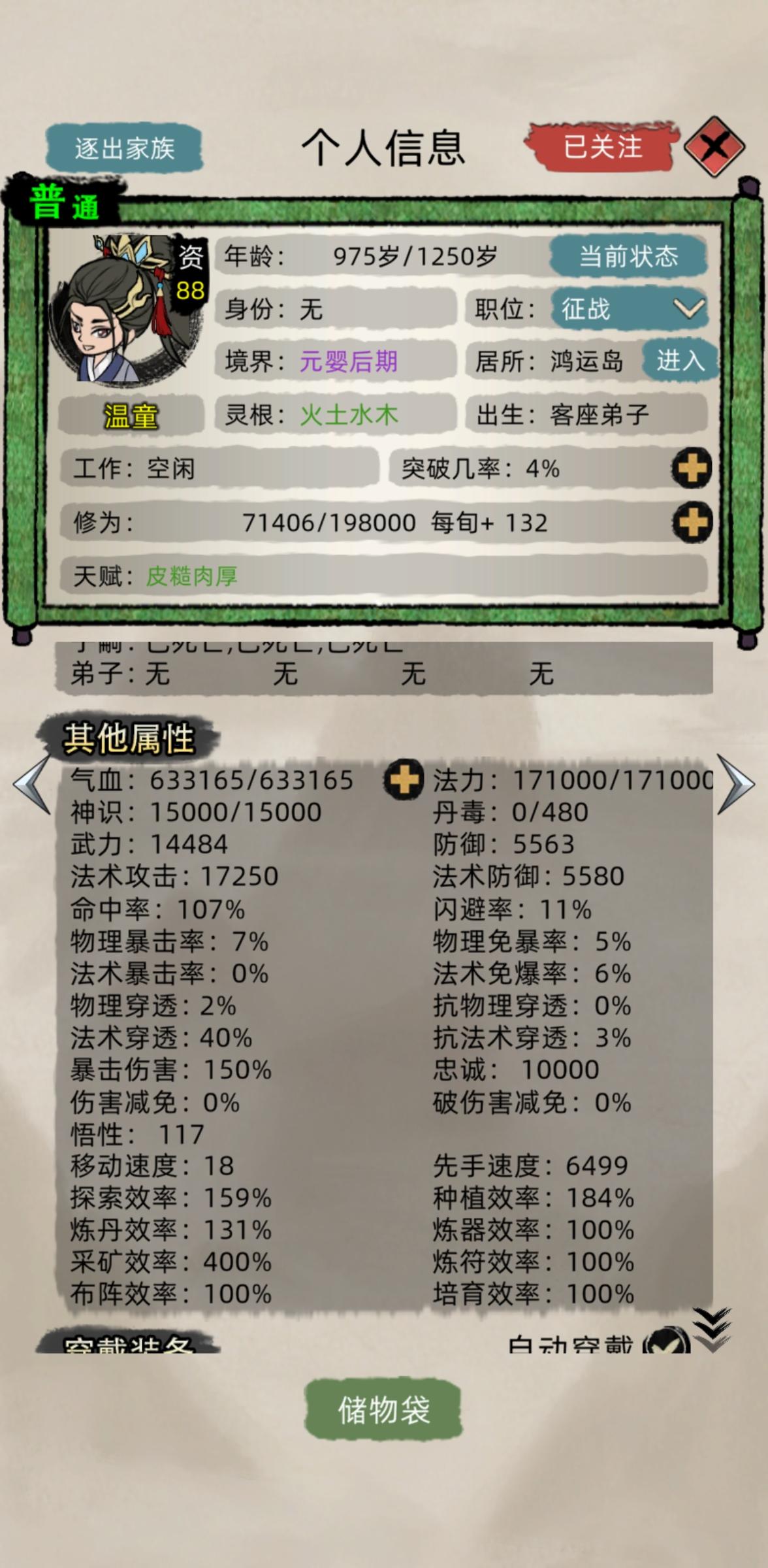 去看了一下大佬的麒麟儿后代突然间就感觉自己的不香了,决定收菜重开,我也要一门五子麒麟儿!新开这个档老祖不再是不死冥王了,而且悟性好弱300%悟性加成才320可见悟性有多低了,我之前都是400多。