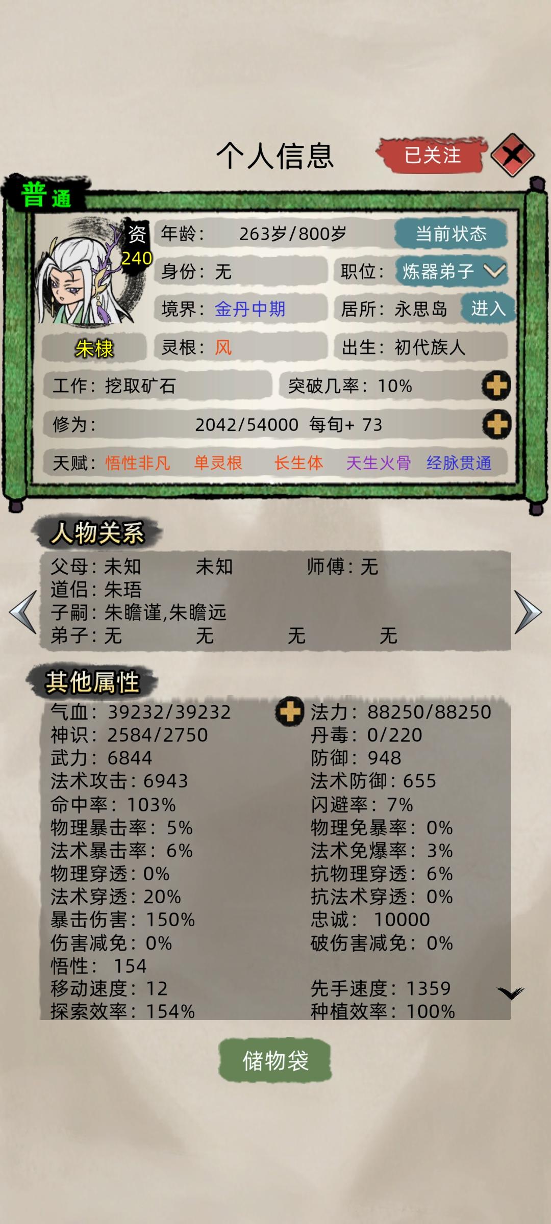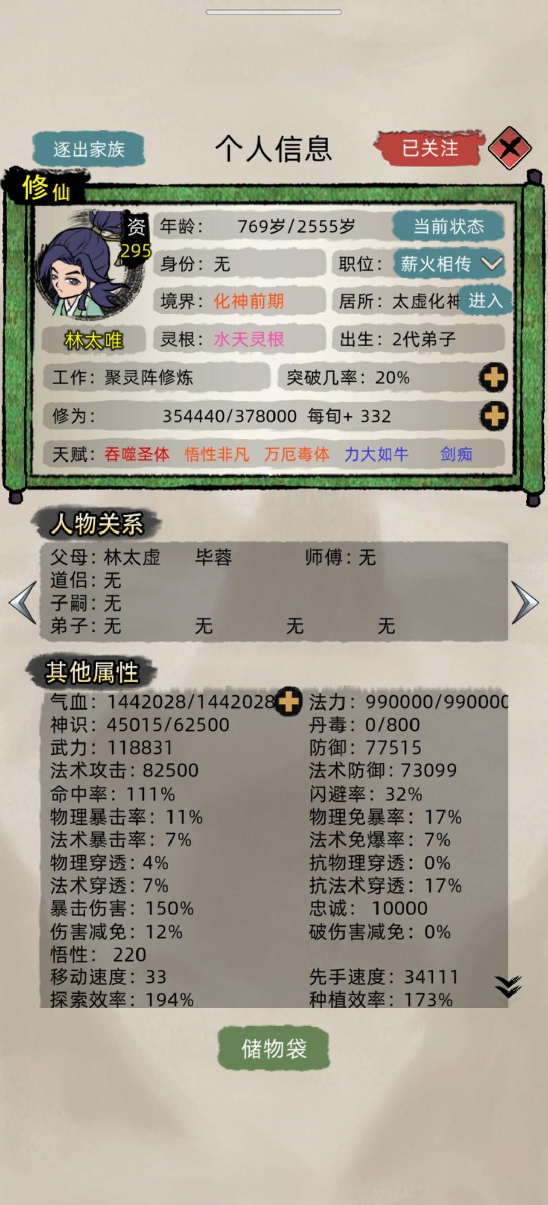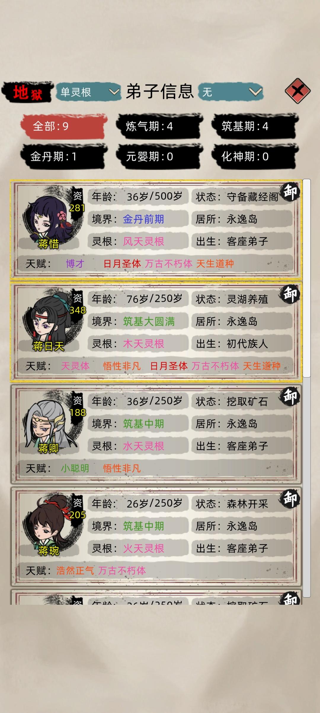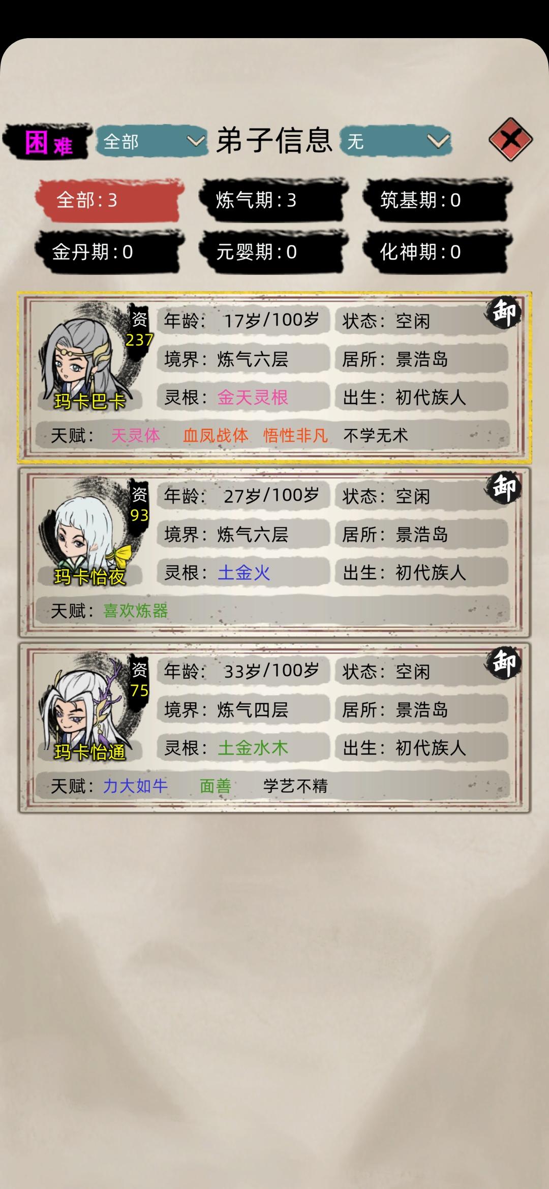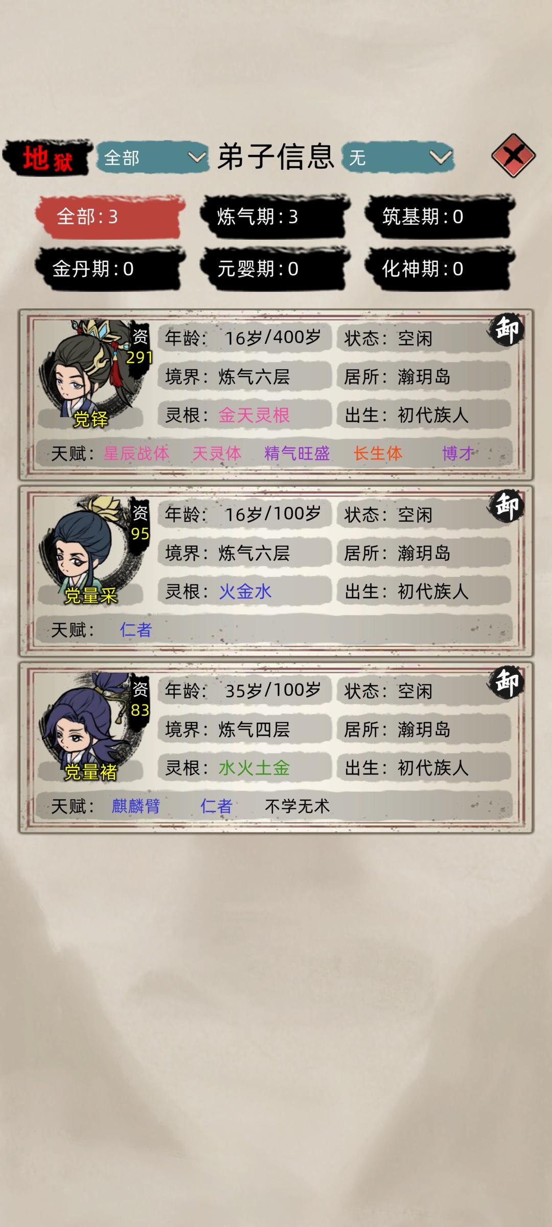 绷不住了,阴盛阳衰,一列高资质全女性,老祖至今为婚,好不容易蹲了个180男性的一看不知道什么时候悄悄结婚了,真难受,上把选男祖开局,后面屋子光棍,这把女祖开局,成桃花岛了,用九龙丹刷成员高资质都是大多女的,男的多少有点负面buff根本不敢配😅