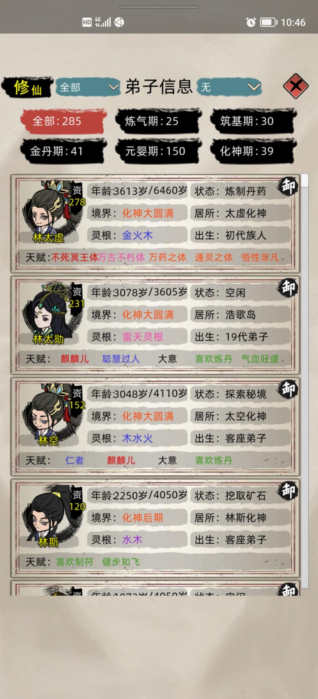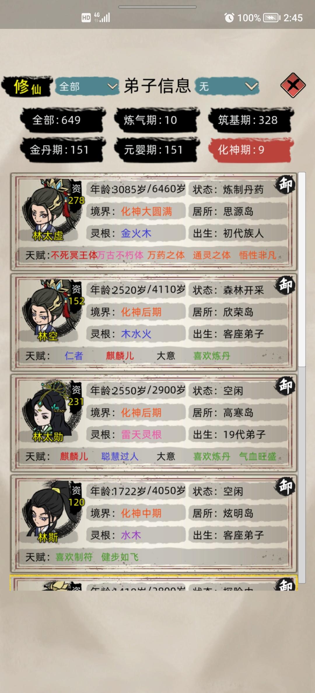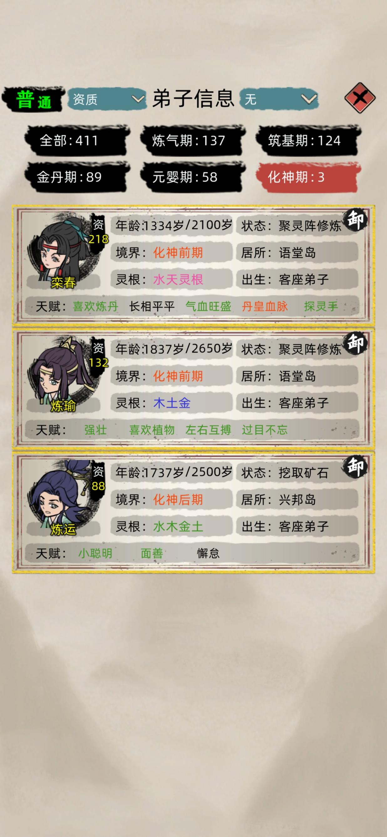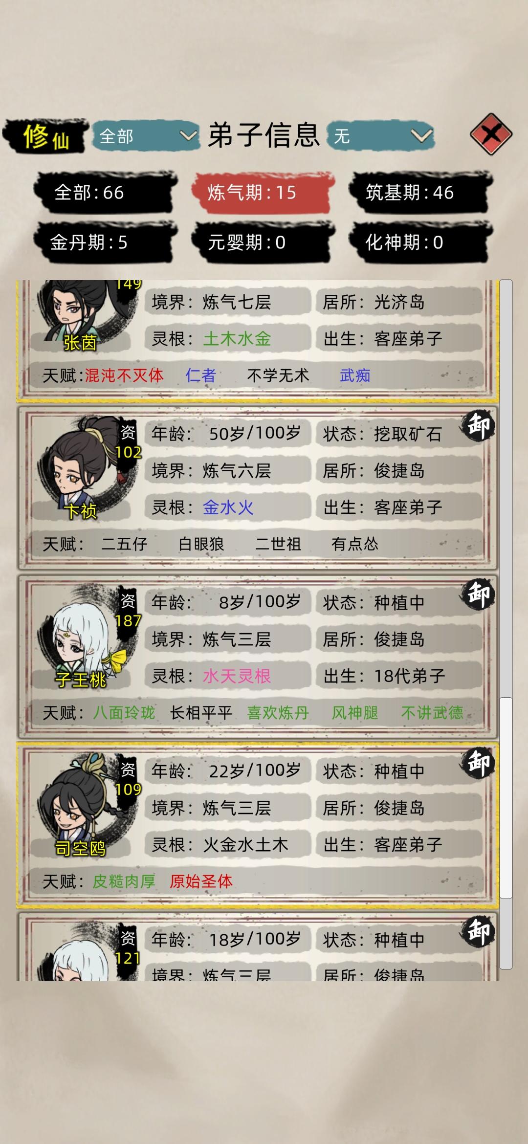 太惨了,我现在的化神弟子出来一个就拉一个去关监狱,断绝灵气供给,只留下几个打手!什么后代子孙,不要也罢,太烧钱了,又卡得飞起!
