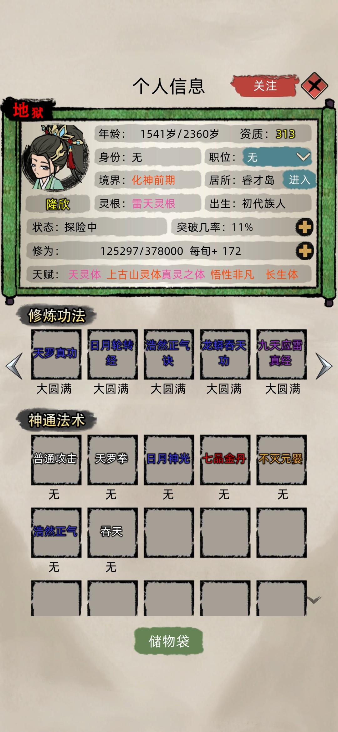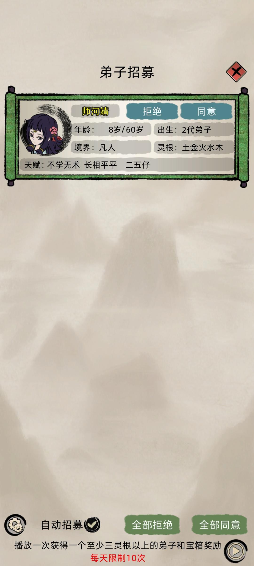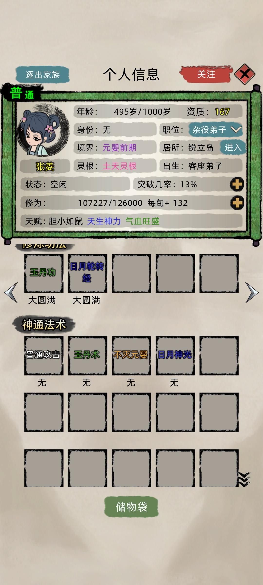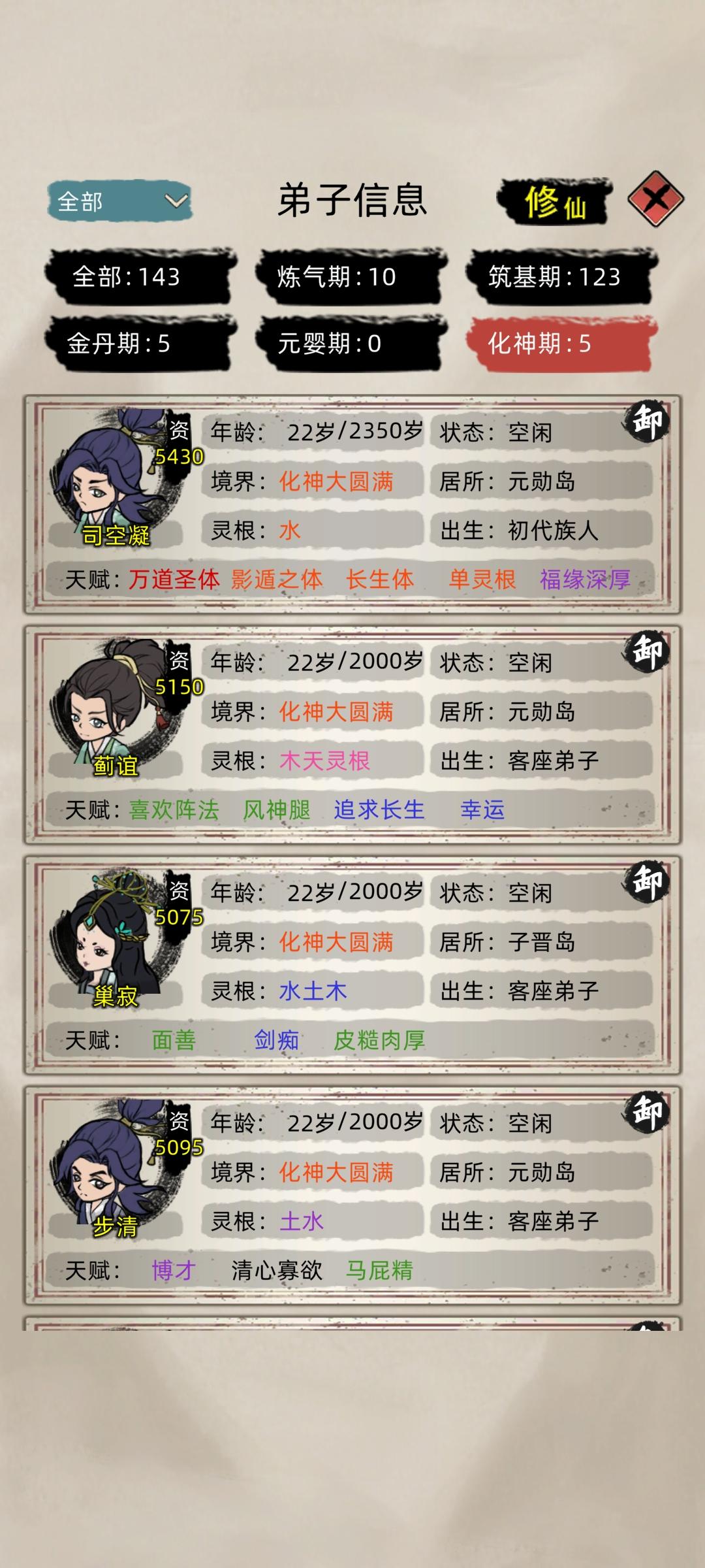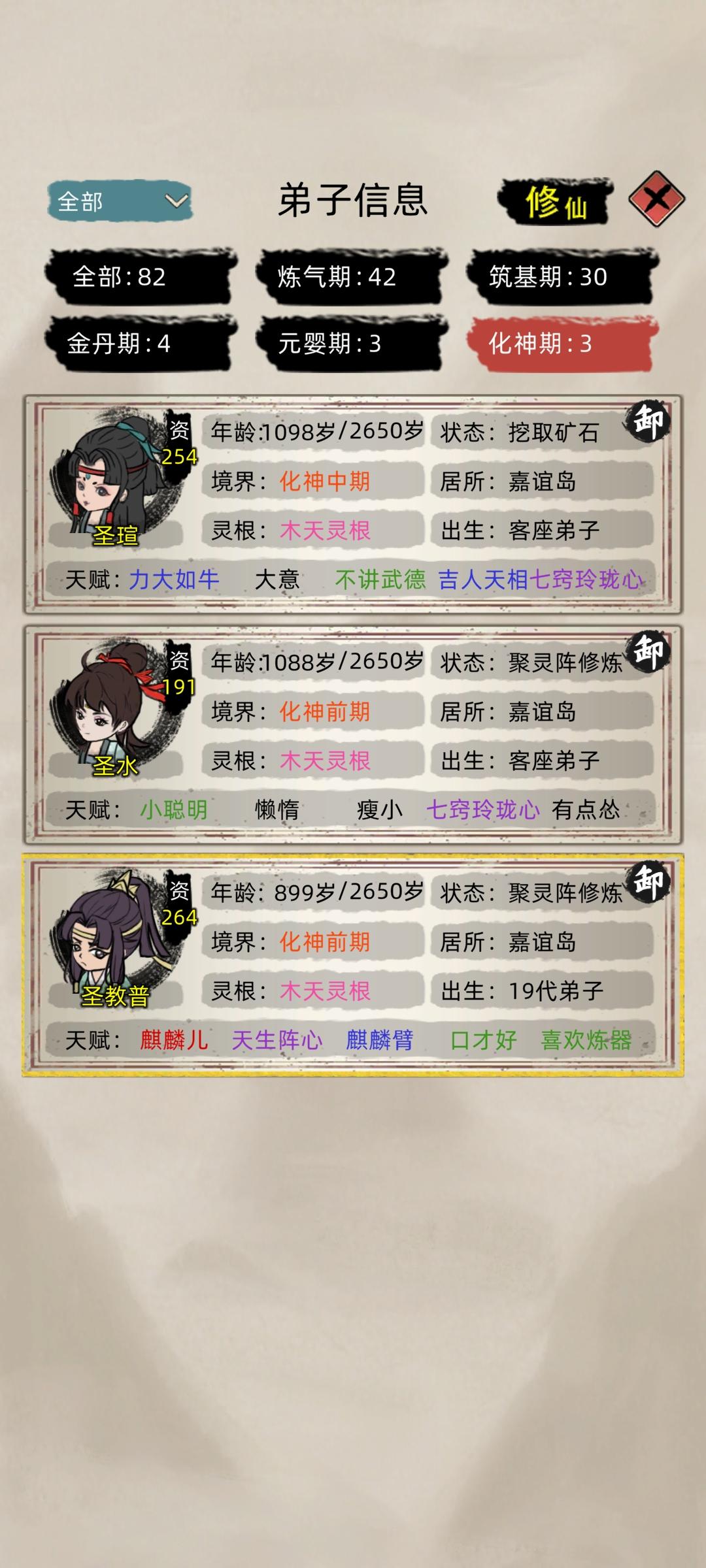 然后退出游戏水群,水着水着突然发现,诶?好像也不难玩,开局把自动招人关掉,手动接收,两百年保护期一过,老祖应该都是金丹期,(也有人元婴,反正我没有。)挨打的时刻到了哈哈哈,老祖带上几个好苗子跑路。